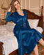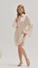 Elegant mid-calf kimono robe with flowy wide sleeves and curved hemline. Features a waist-cinching belt and full-length silhouette, perfect for relaxed lounging with a graceful touch.