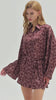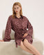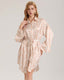 Elegant long-sleeve shirt dress with vintage-inspired prints and waist-defining belt. Side-curved hem adds a flattering touch. Ideal for relaxed lounging with effortless style and comfort.