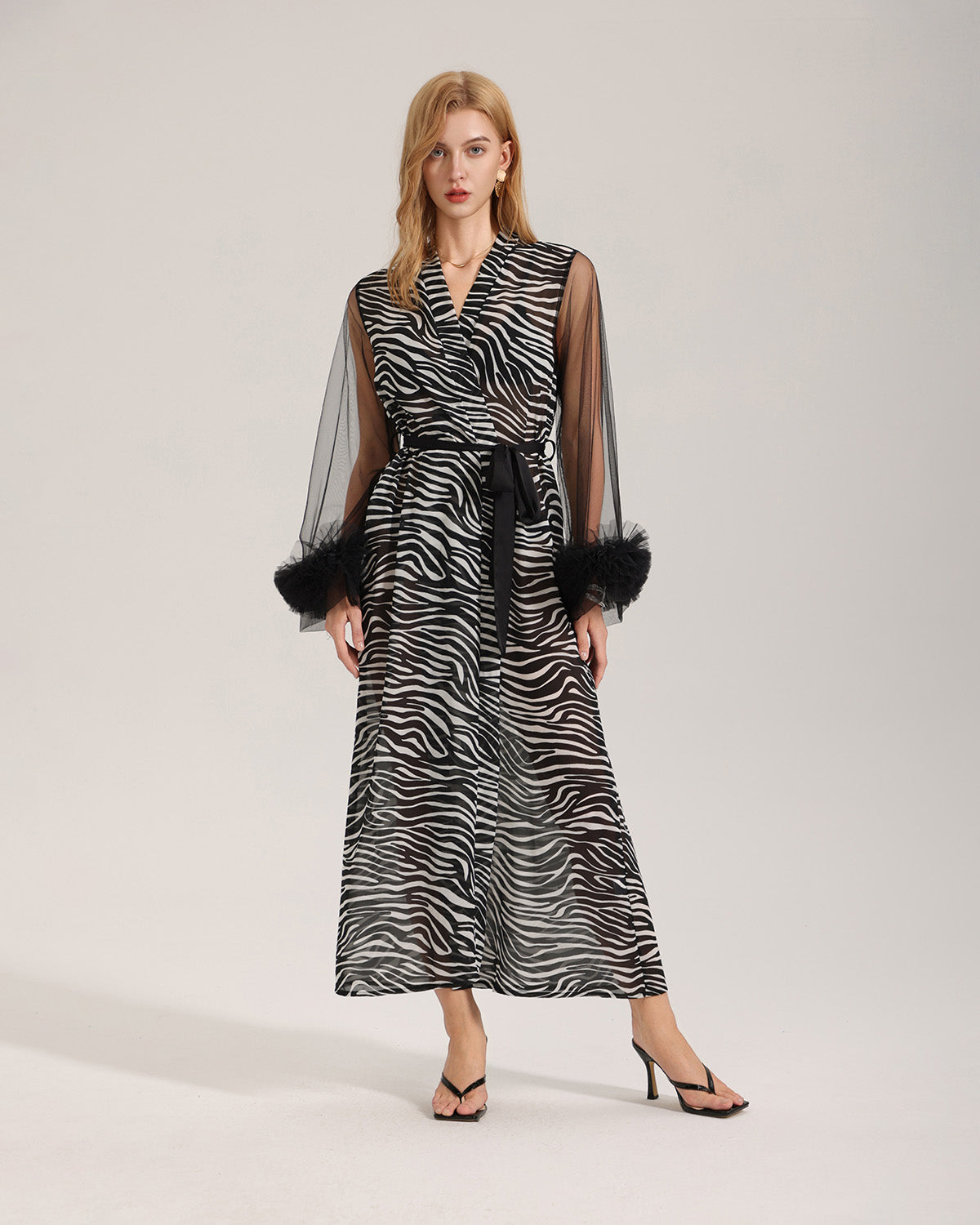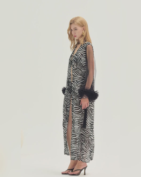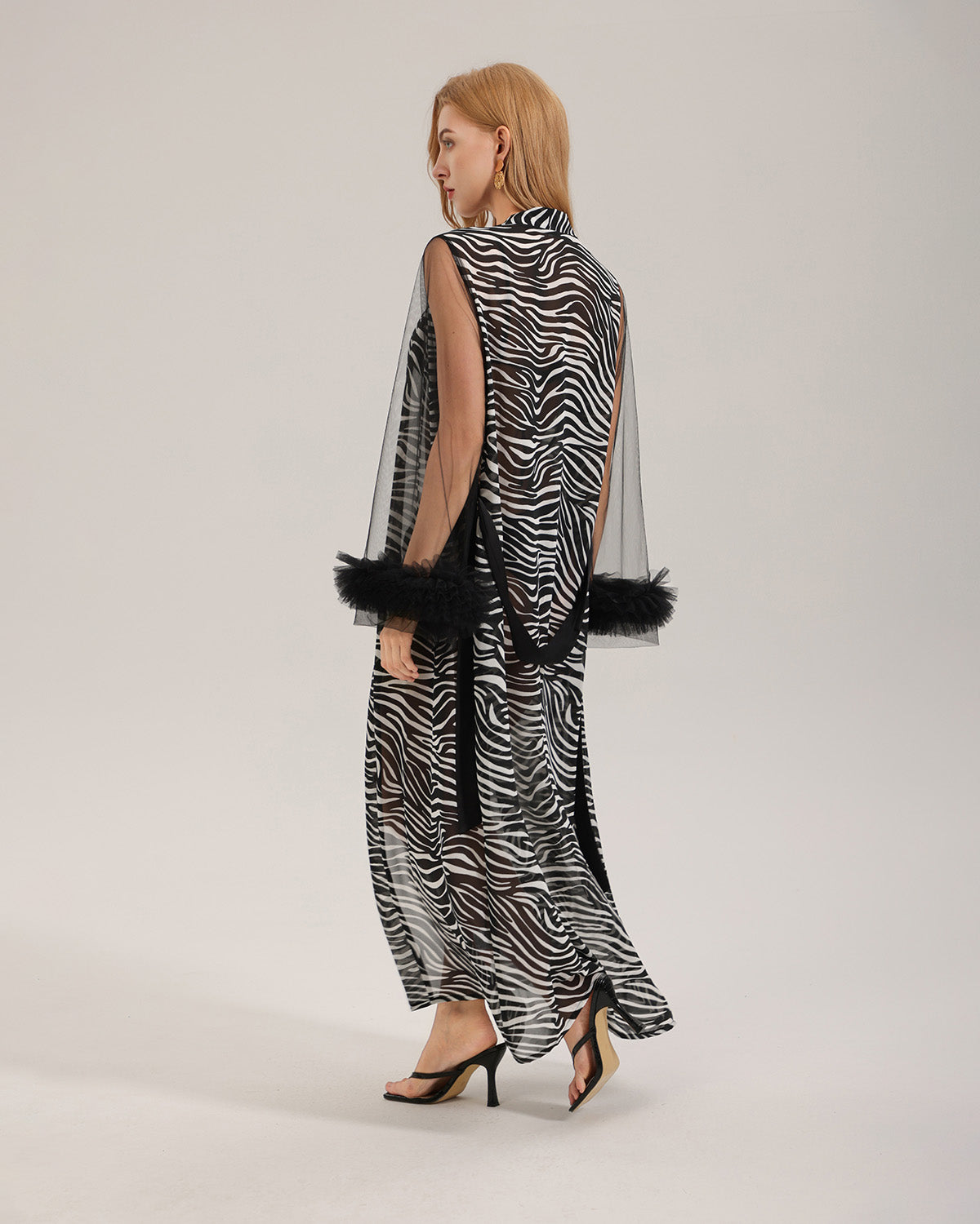 Black White Zebra Mesh Sleeve Fluffy Trim Long Robe