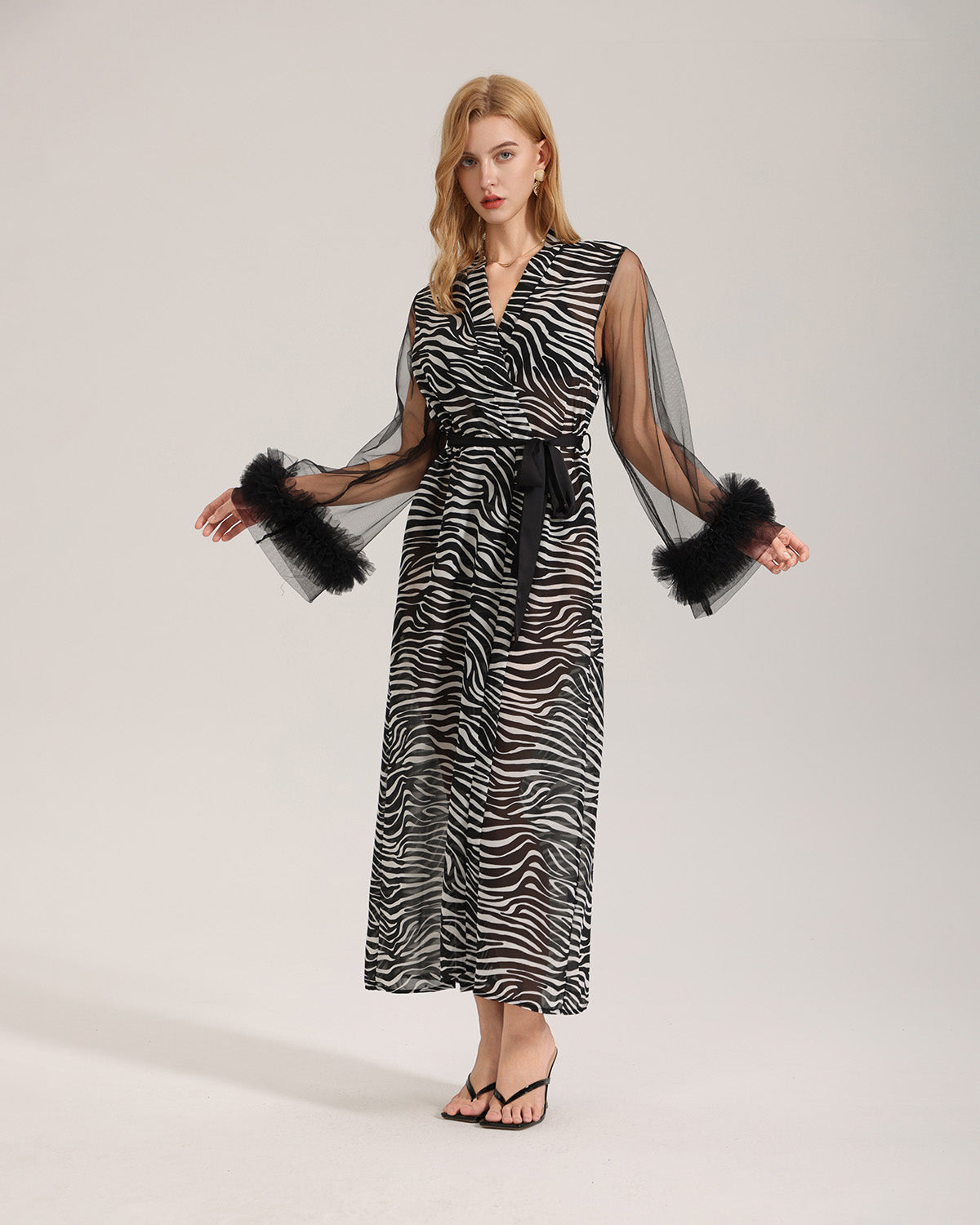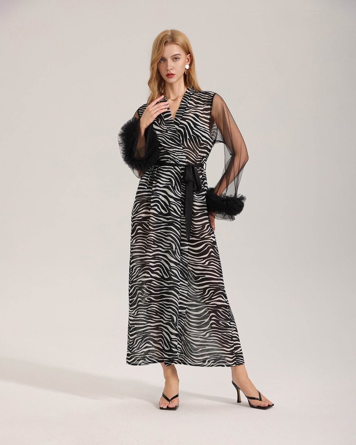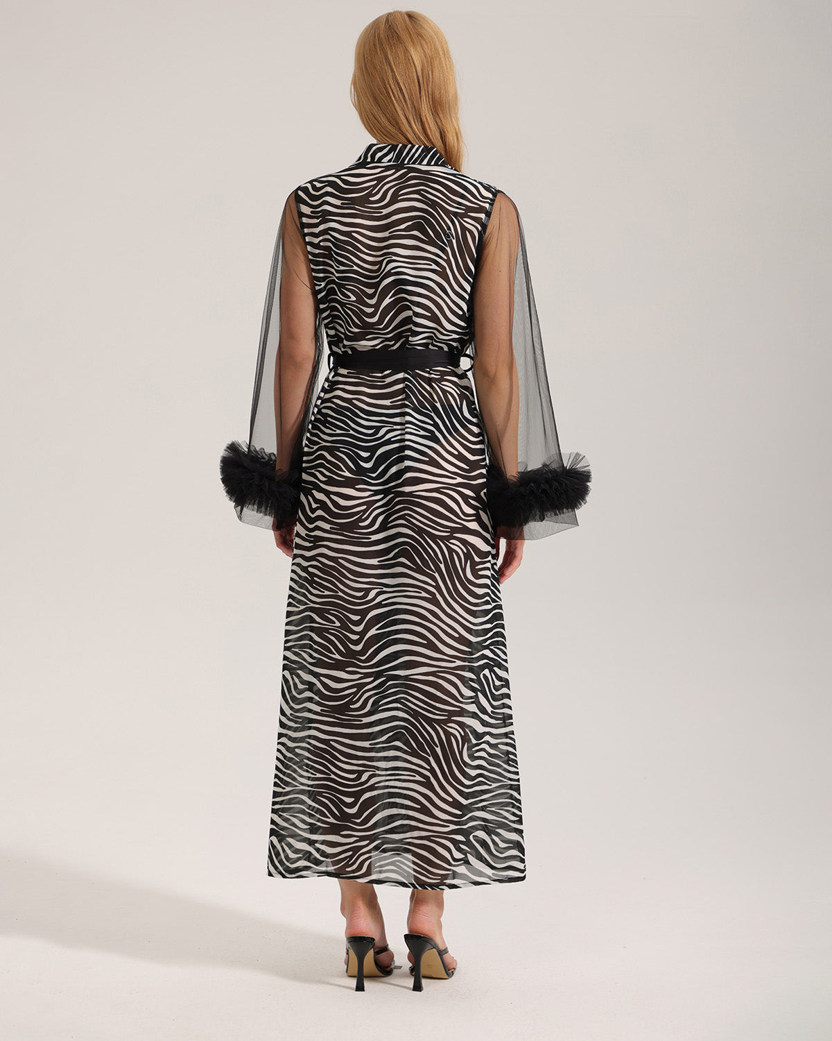 Black White Zebra Mesh Sleeve Fluffy Trim Long Robe