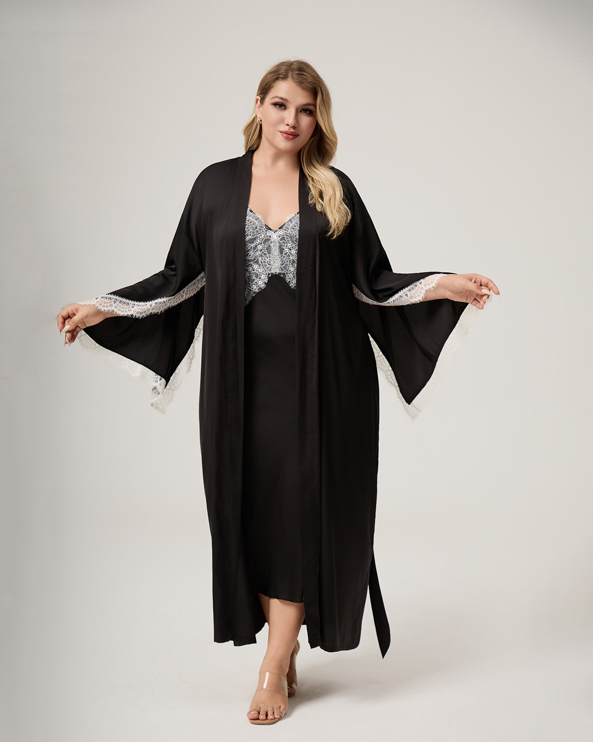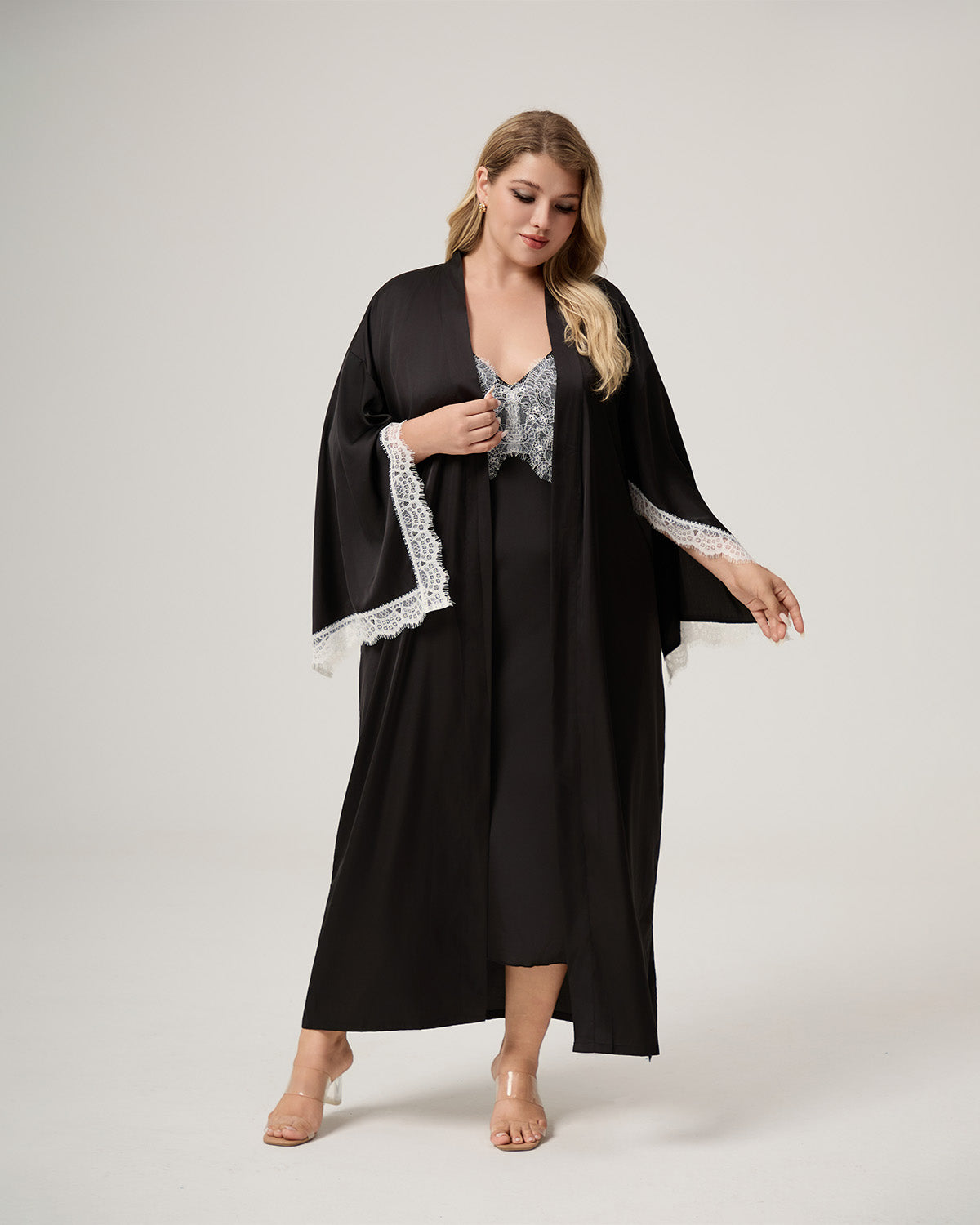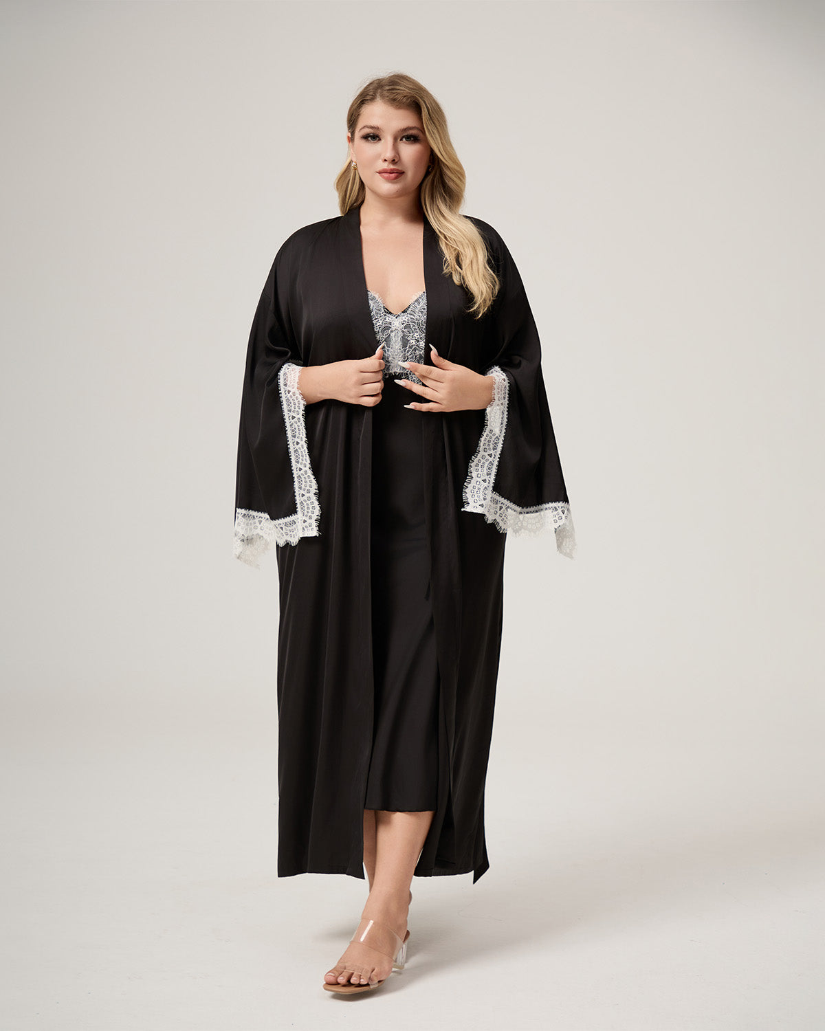 Indulge in a world of luxury and comfort with our Black Faux Silk Pajama Set. This elegant two-piece ensemble features a V-neck camisole and matching long-sleeve robe with delicate lace trim, offering the sophisticated look of real silk at an accessible price point. Western-inspired design with inclusive sizing makes this set perfect for both lounging and restful sleep.