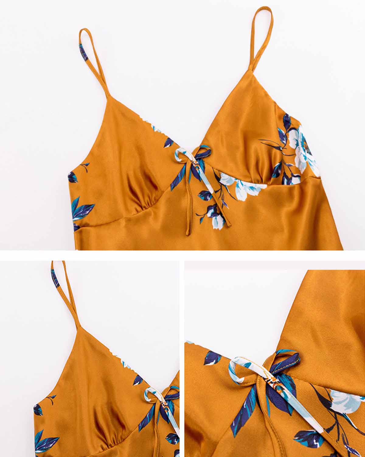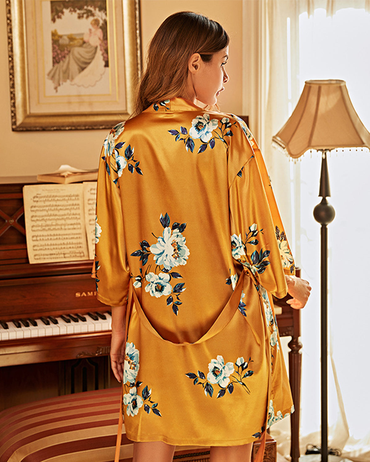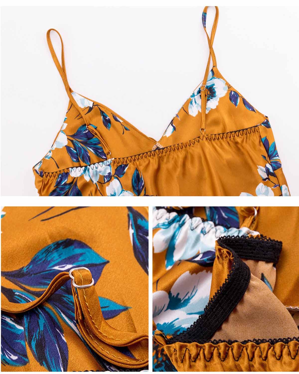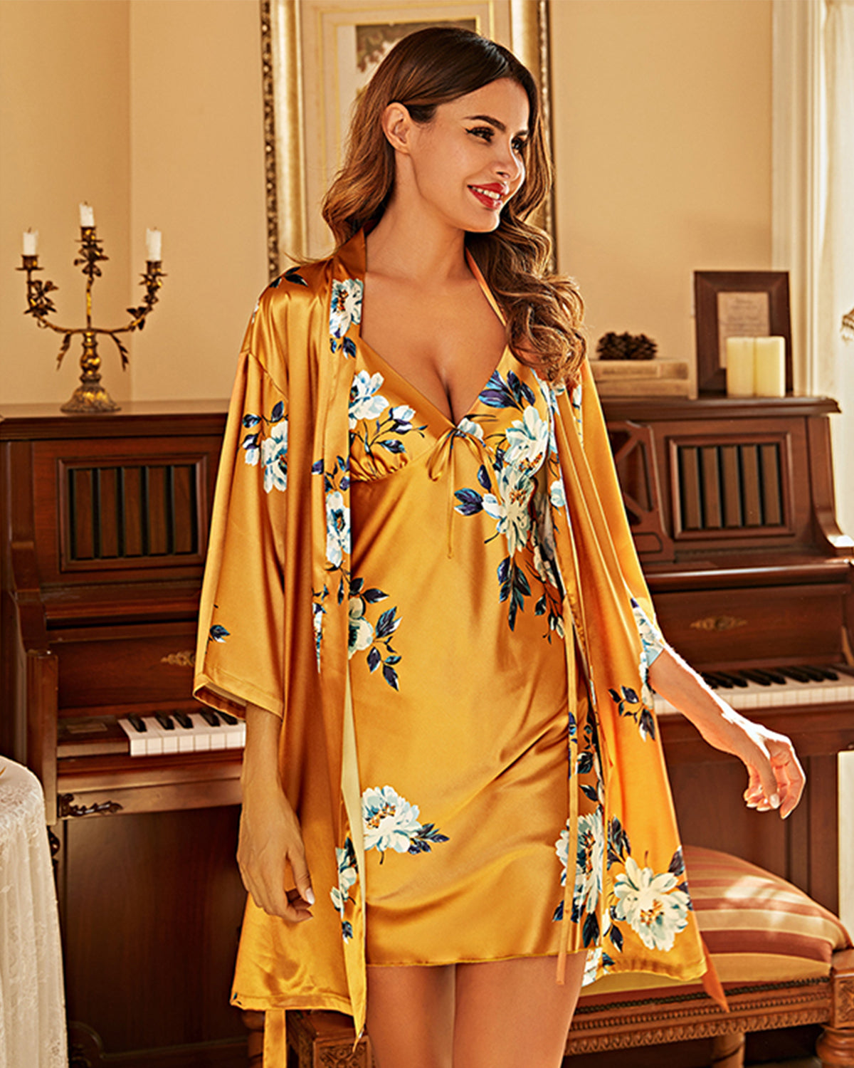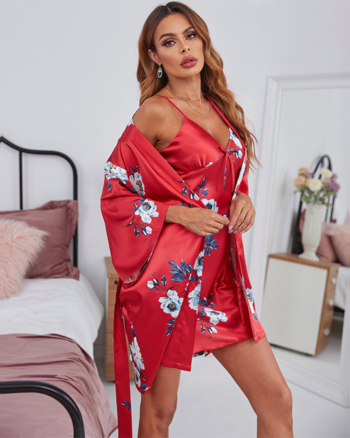 Two-piece summer set with printed camisole nightdress and matching robe. Soft ice silk, breathable and lightweight, designed for stylish comfort at home.