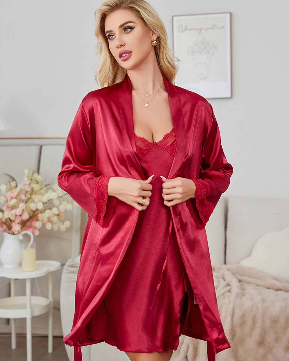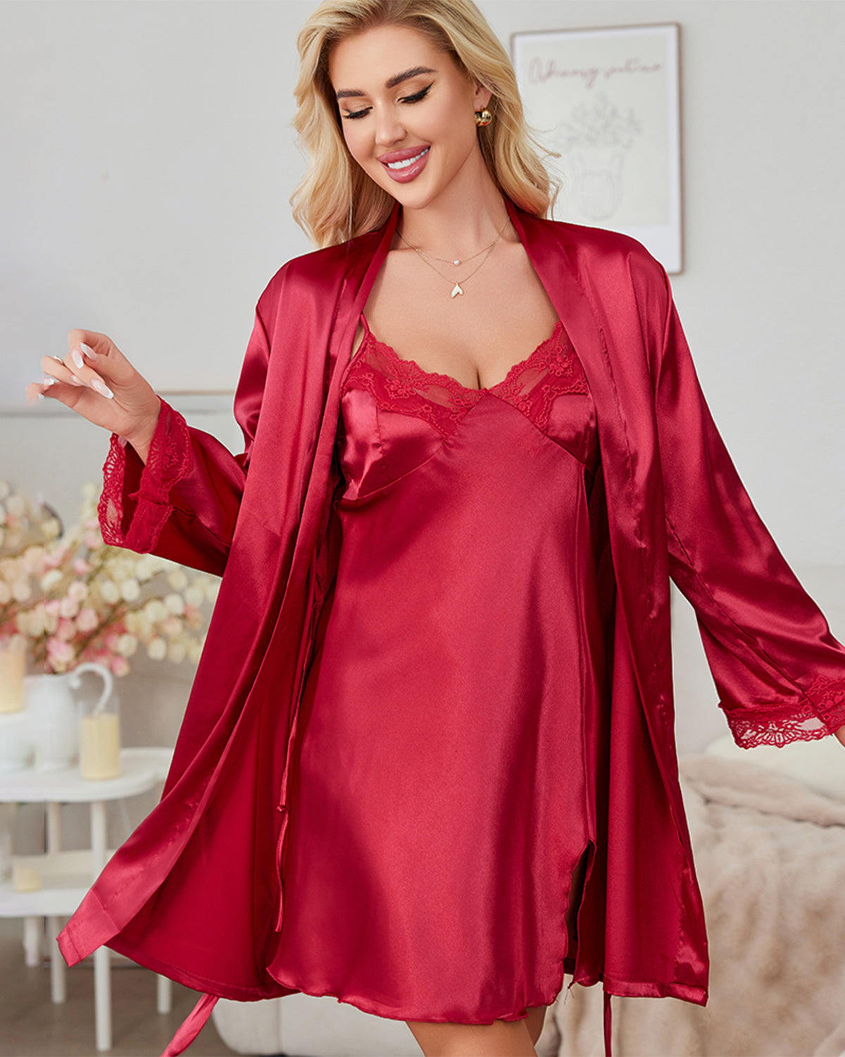 Two-piece ice silk set with lace-trimmed camisole nightdress and matching robe. Smooth and breathable fabric with elegant lace details and thigh-length cut, designed for both comfort and style.