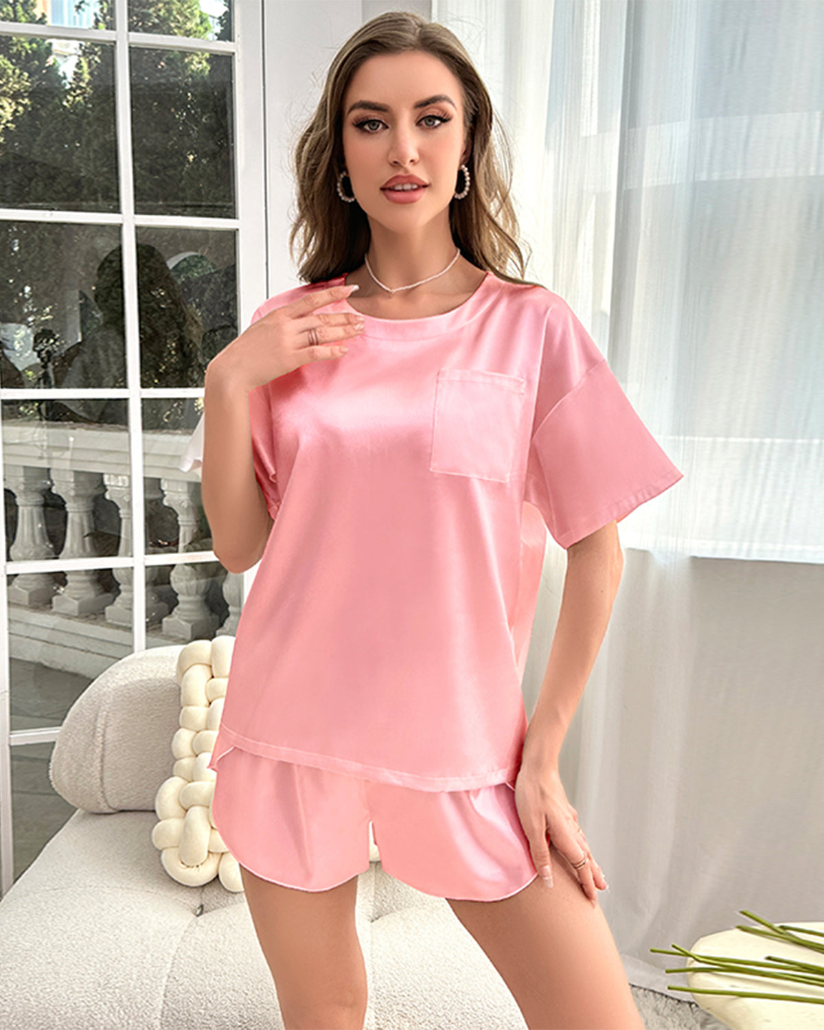 Lightweight ice silk pajama set with a short-sleeve button top and curved-hem shorts. Cool, breathable, and relaxed, designed for summer comfort and everyday lounging.