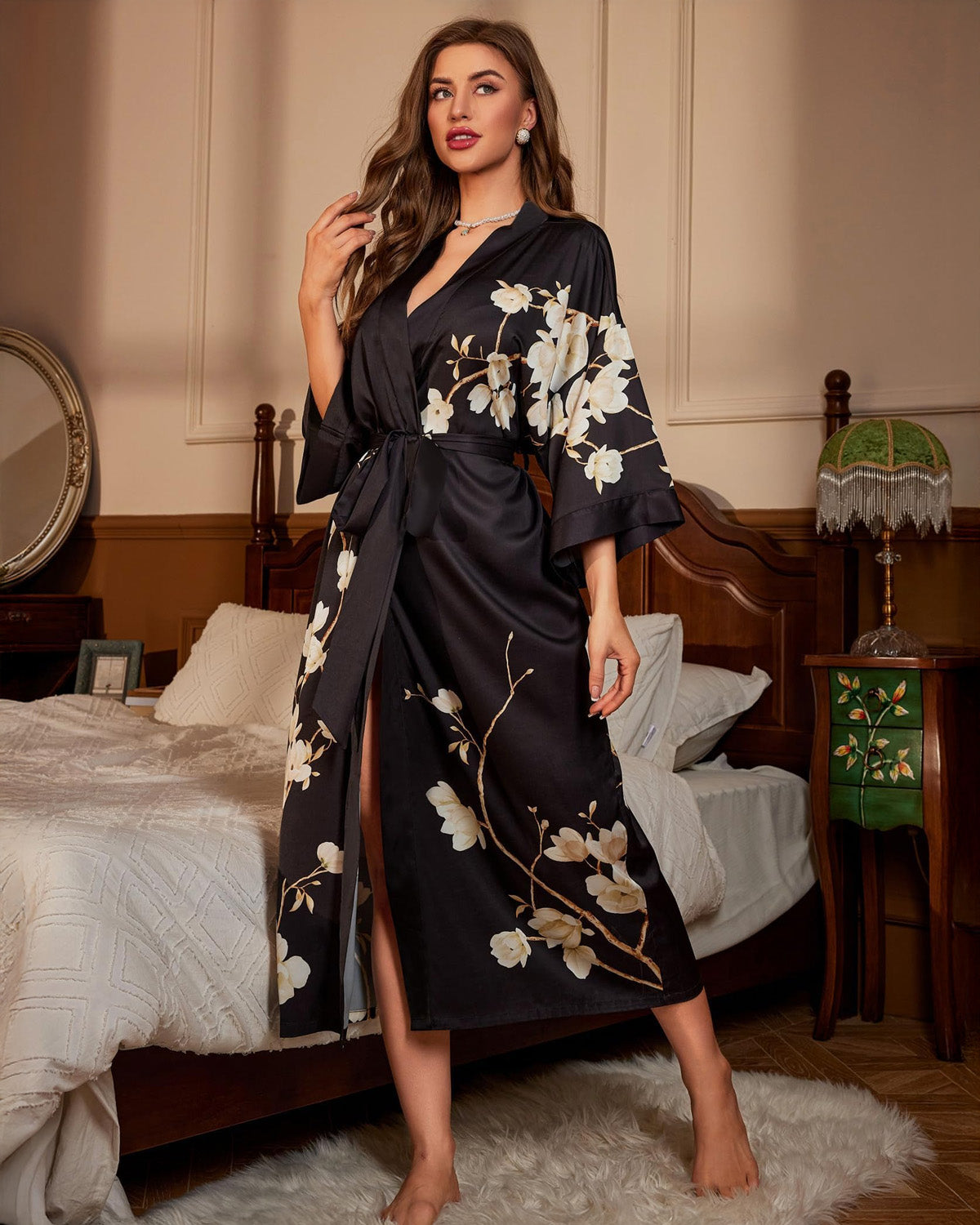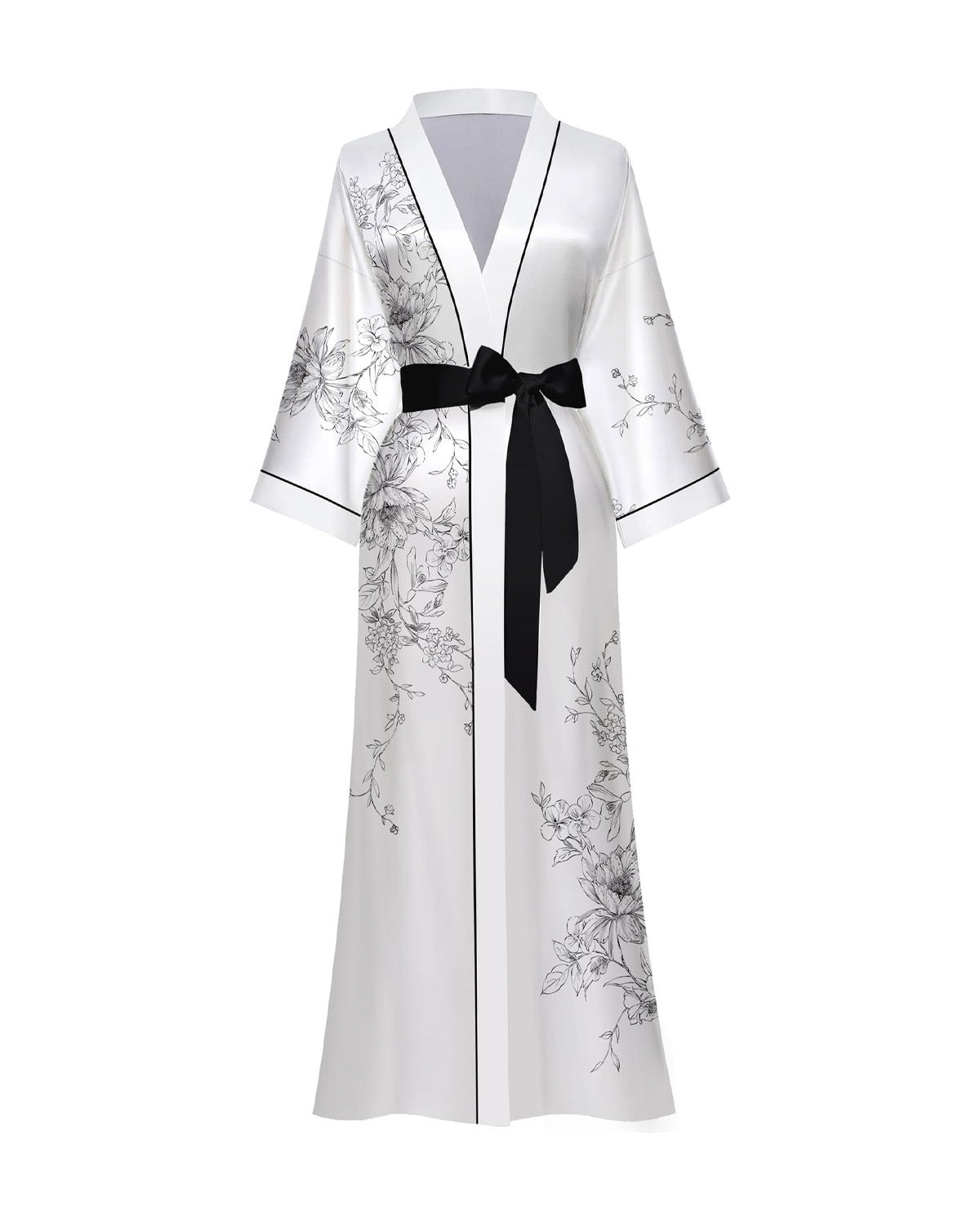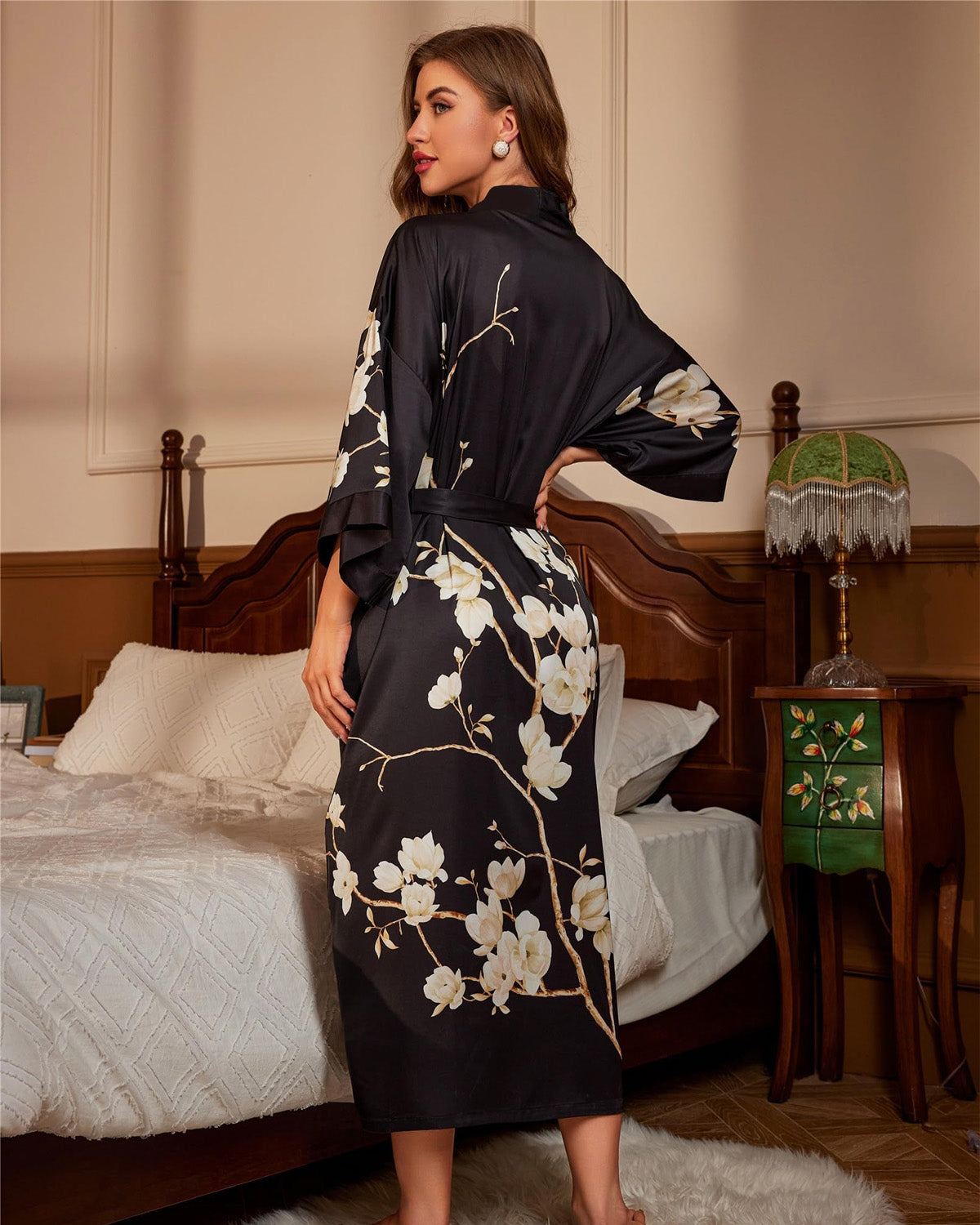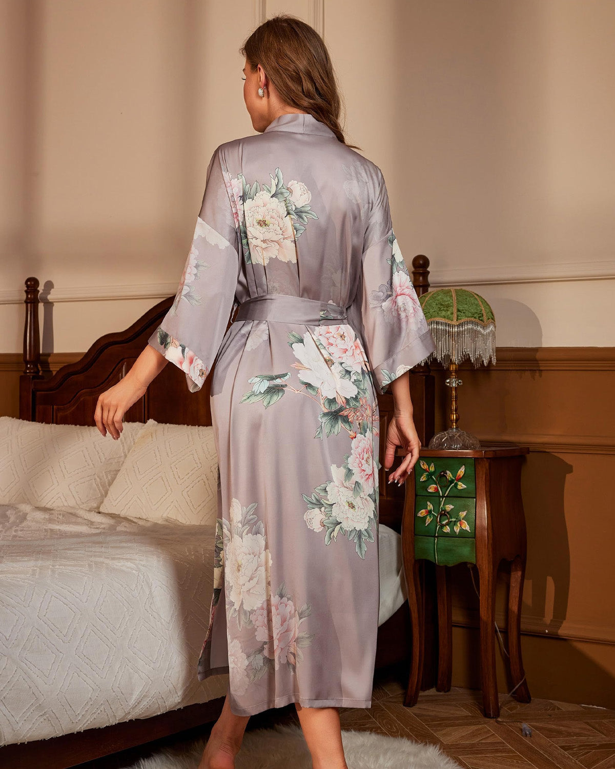 Luxurious Satin Kimono Robe – Wrap yourself in ultra-soft charmeuse satin with a delicate drape and elegant floral prints. This lightweight, glossy robe feels like silk against your skin, offering effortless glamour for lounging, spa days, or getting ready in style.