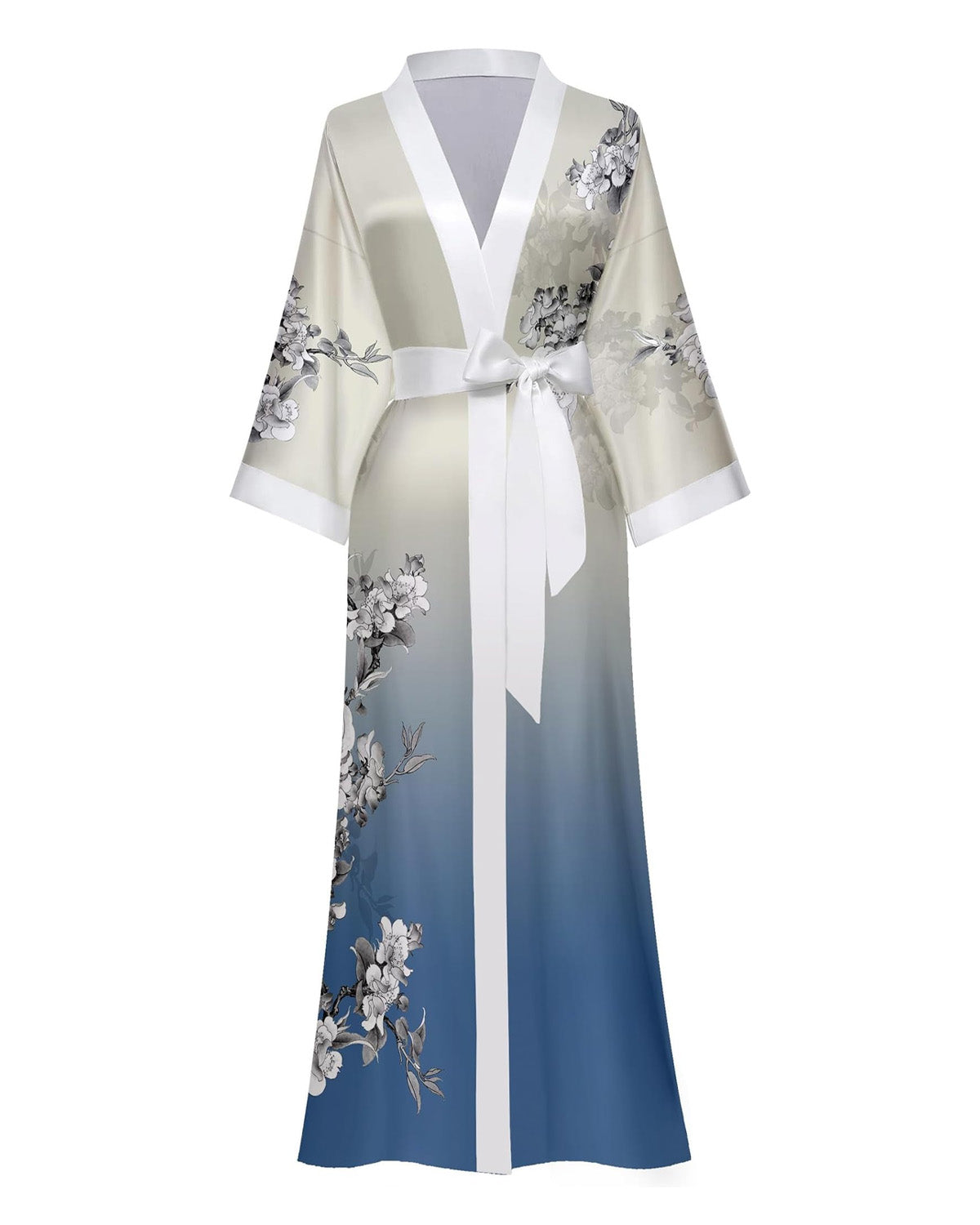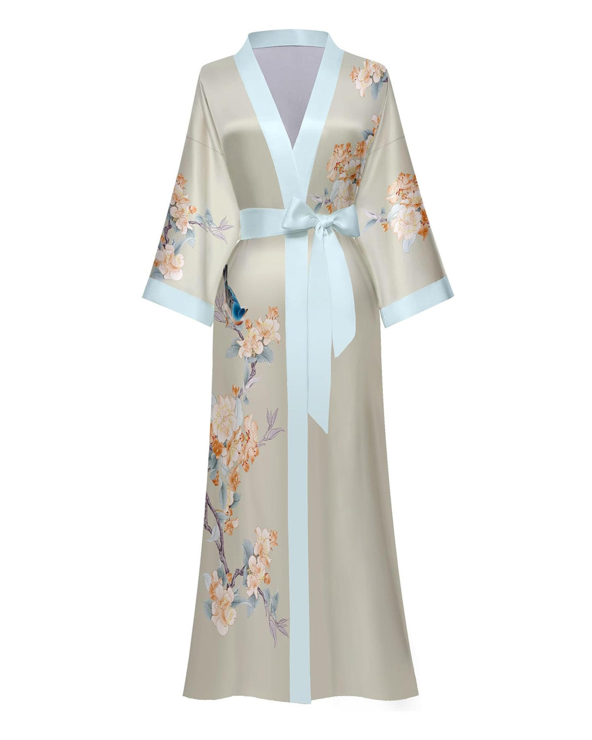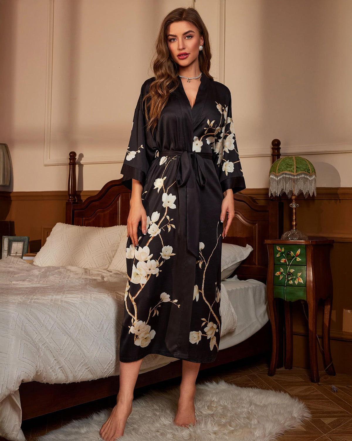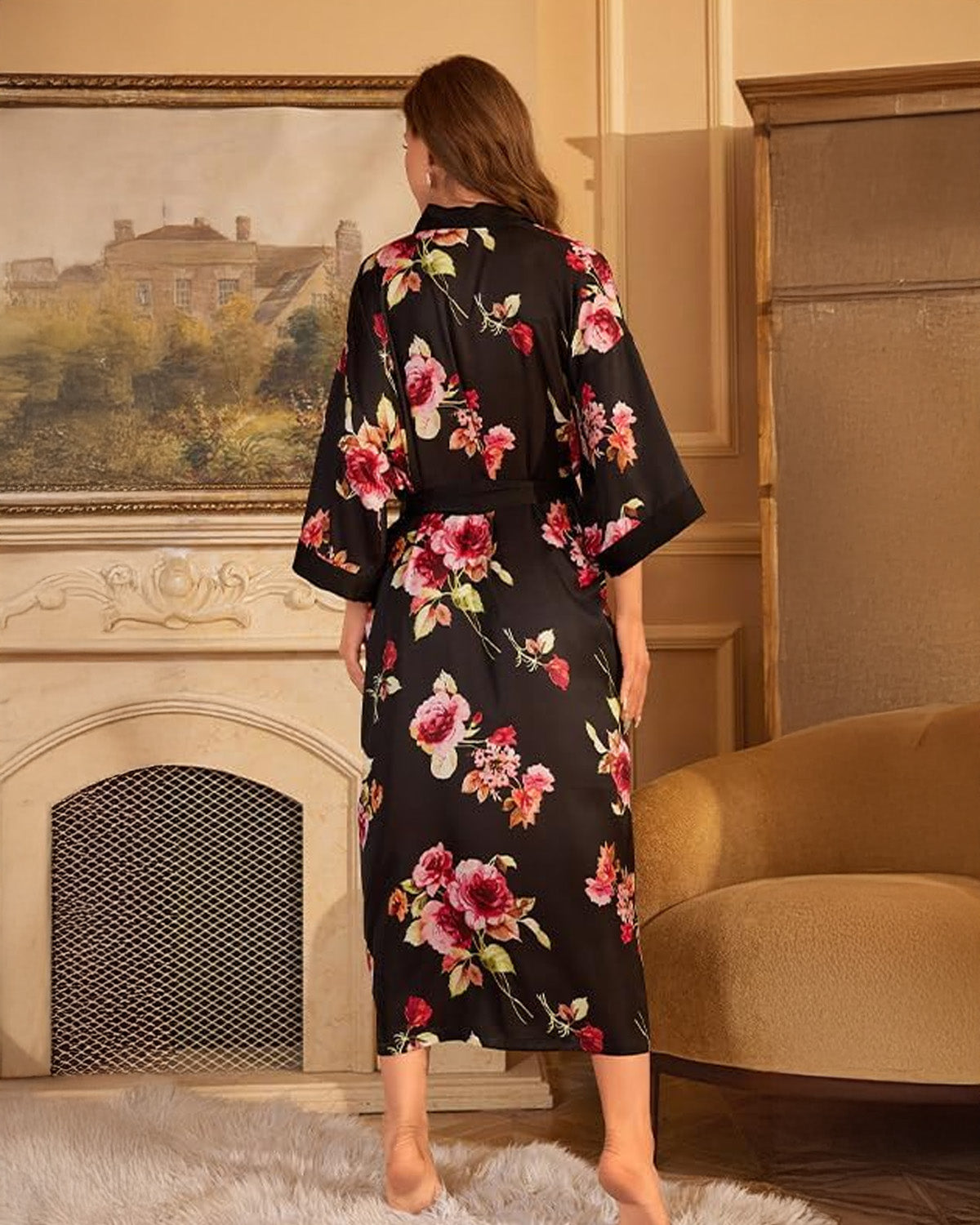 Luxurious Satin Kimono Robe – Wrap yourself in ultra-soft charmeuse satin with a delicate drape and elegant floral prints. This lightweight, glossy robe feels like silk against your skin, offering effortless glamour for lounging, spa days, or getting ready in style.
