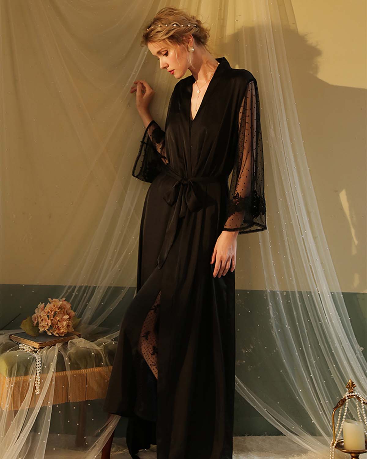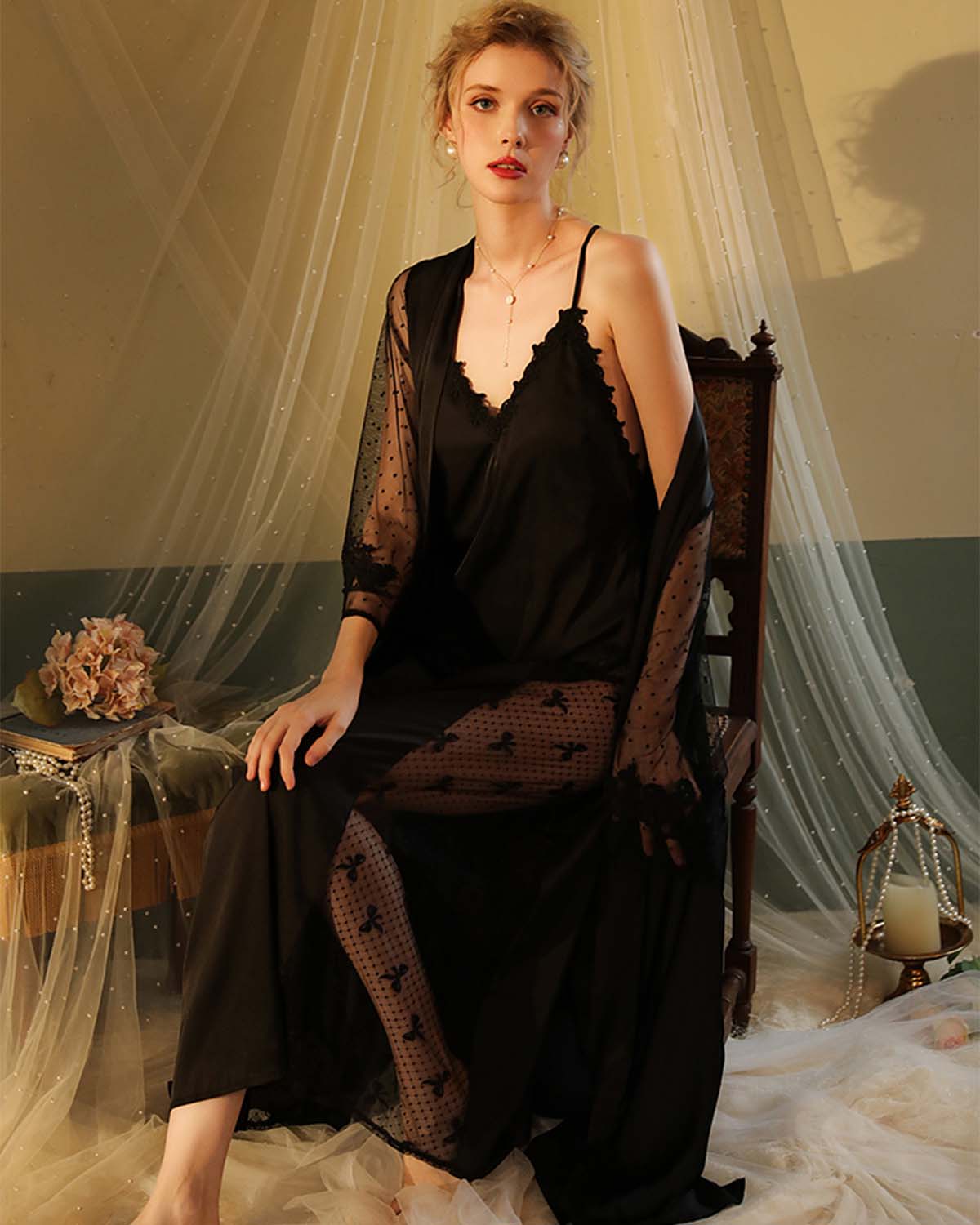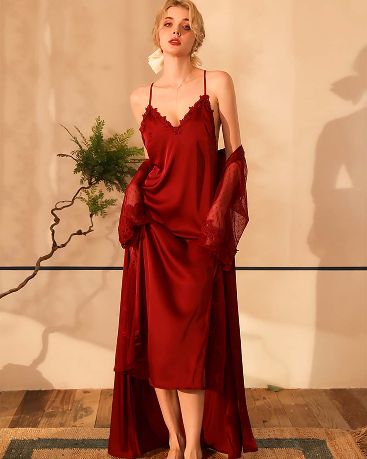 Two-piece satin sleepwear set featuring a lace-trimmed robe and open-back slip. Smooth satin fabric with sheer side panels and romantic detailing for elegant nights.