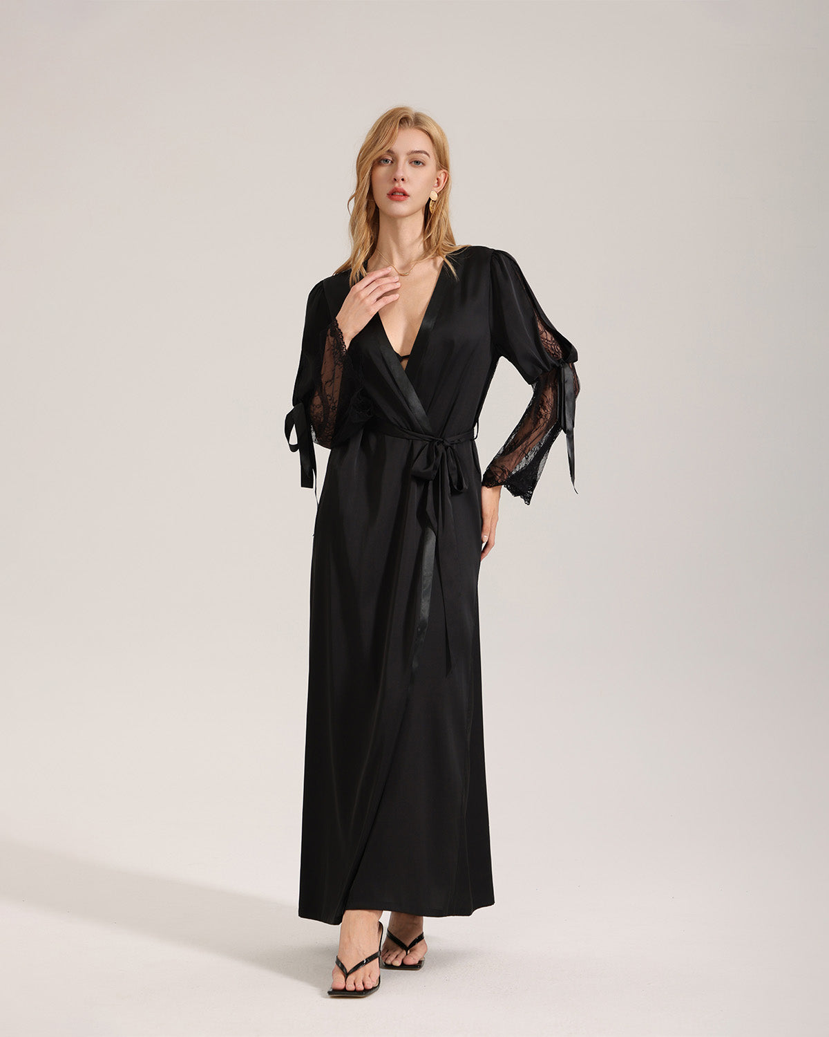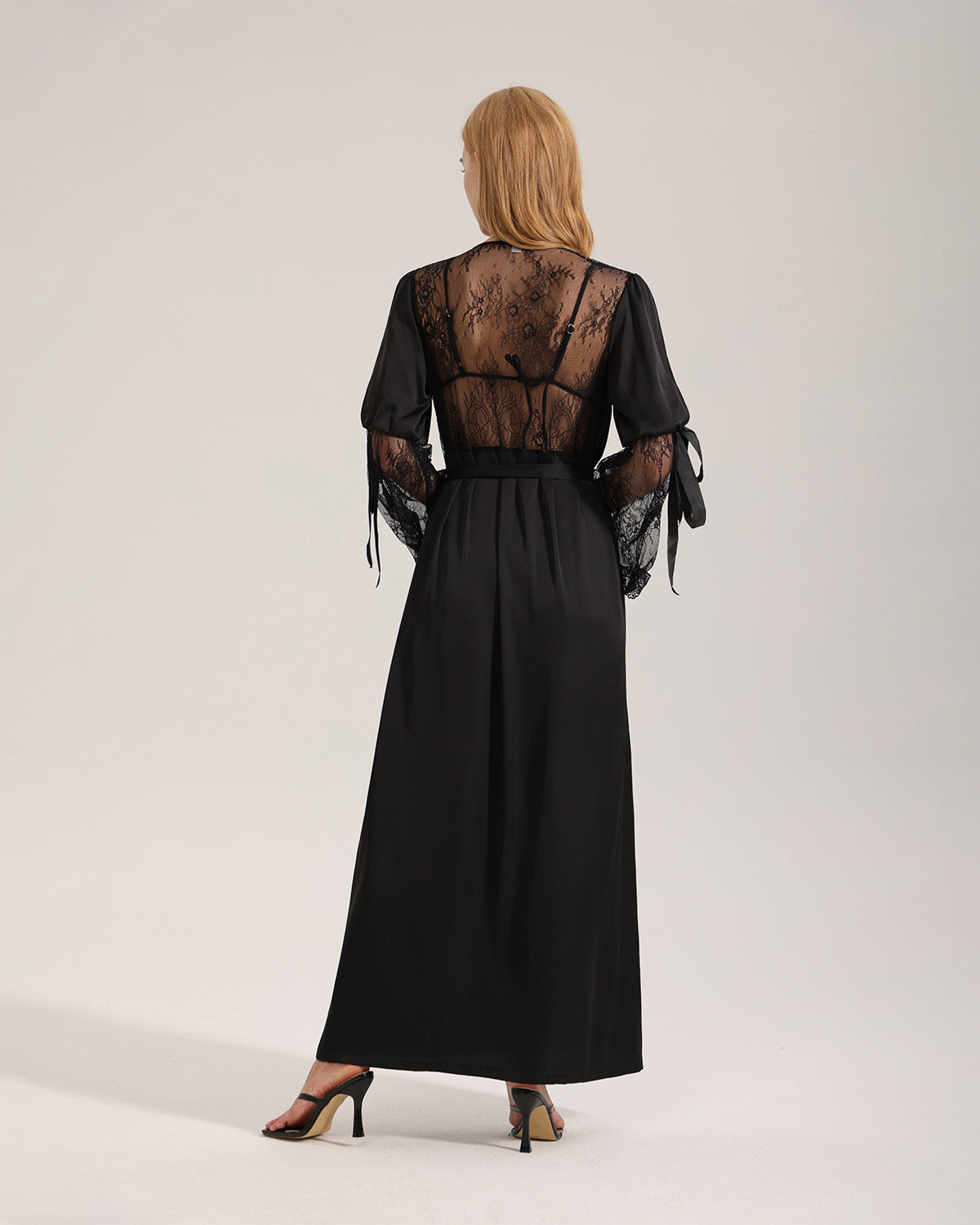 Indulge in the allure of the Midnight Lace Whisper Robe. This stunning black robe is crafted from whisper-light satin chiffon, designed to drape effortlessly and feel utterly luxurious against your skin. The delicate lace detailing adds a touch of romantic intrigue, making it perfect for sensual relaxation or luxurious mornings.