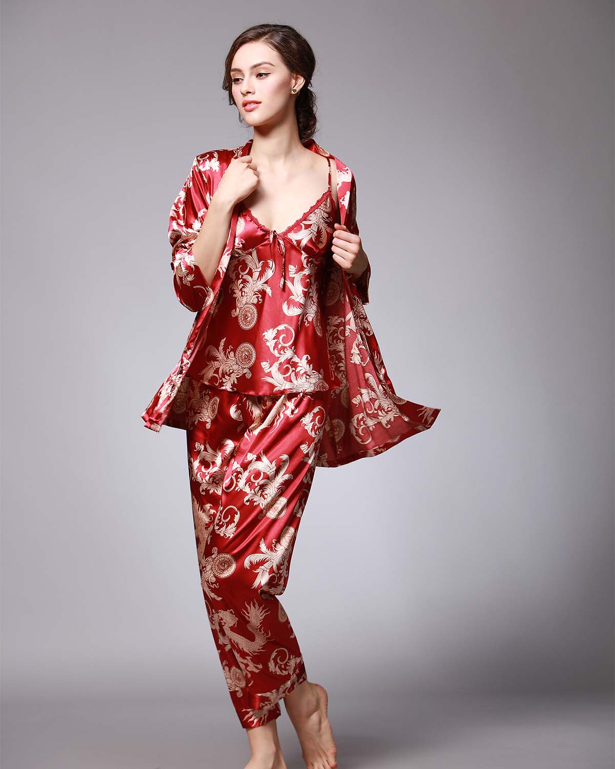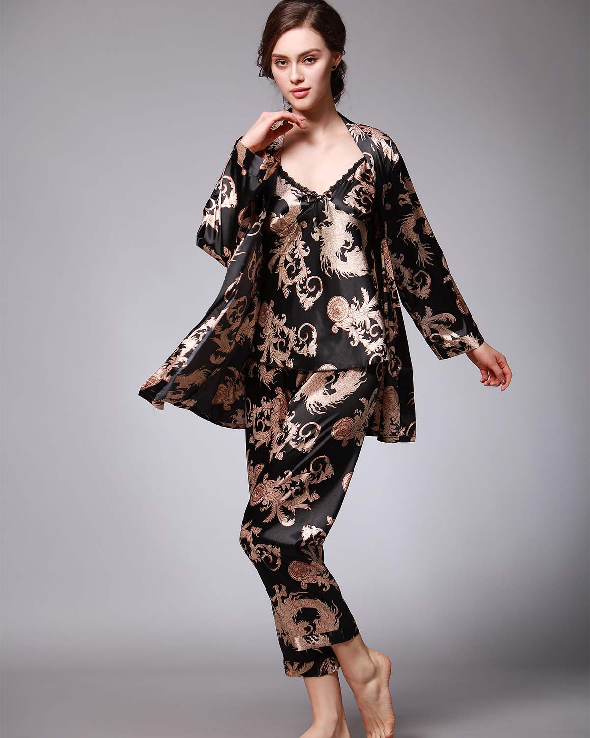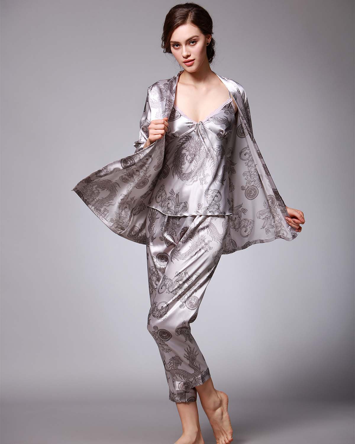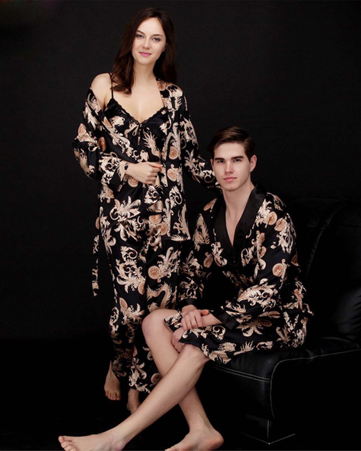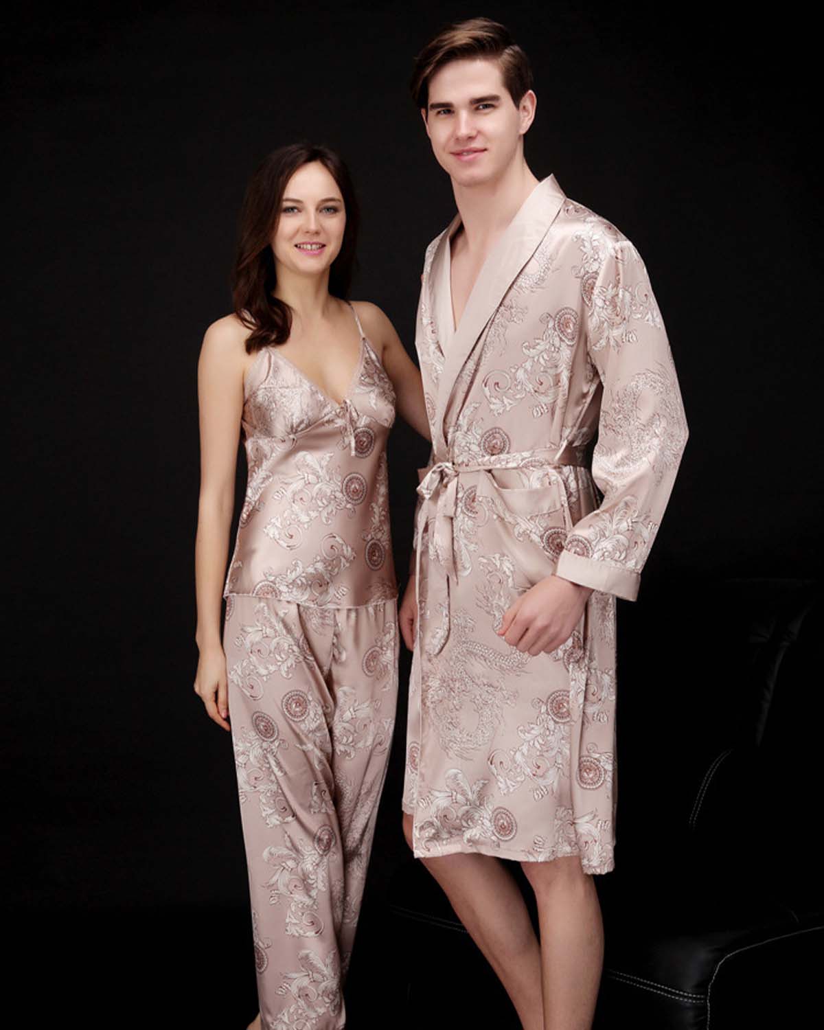 Elegant 3-piece loungewear set with Oriental dragon print, featuring deep V cami, matching pants, and short robe—perfect alone or paired with the coordinating men’s robe for a stylish couple’s look.