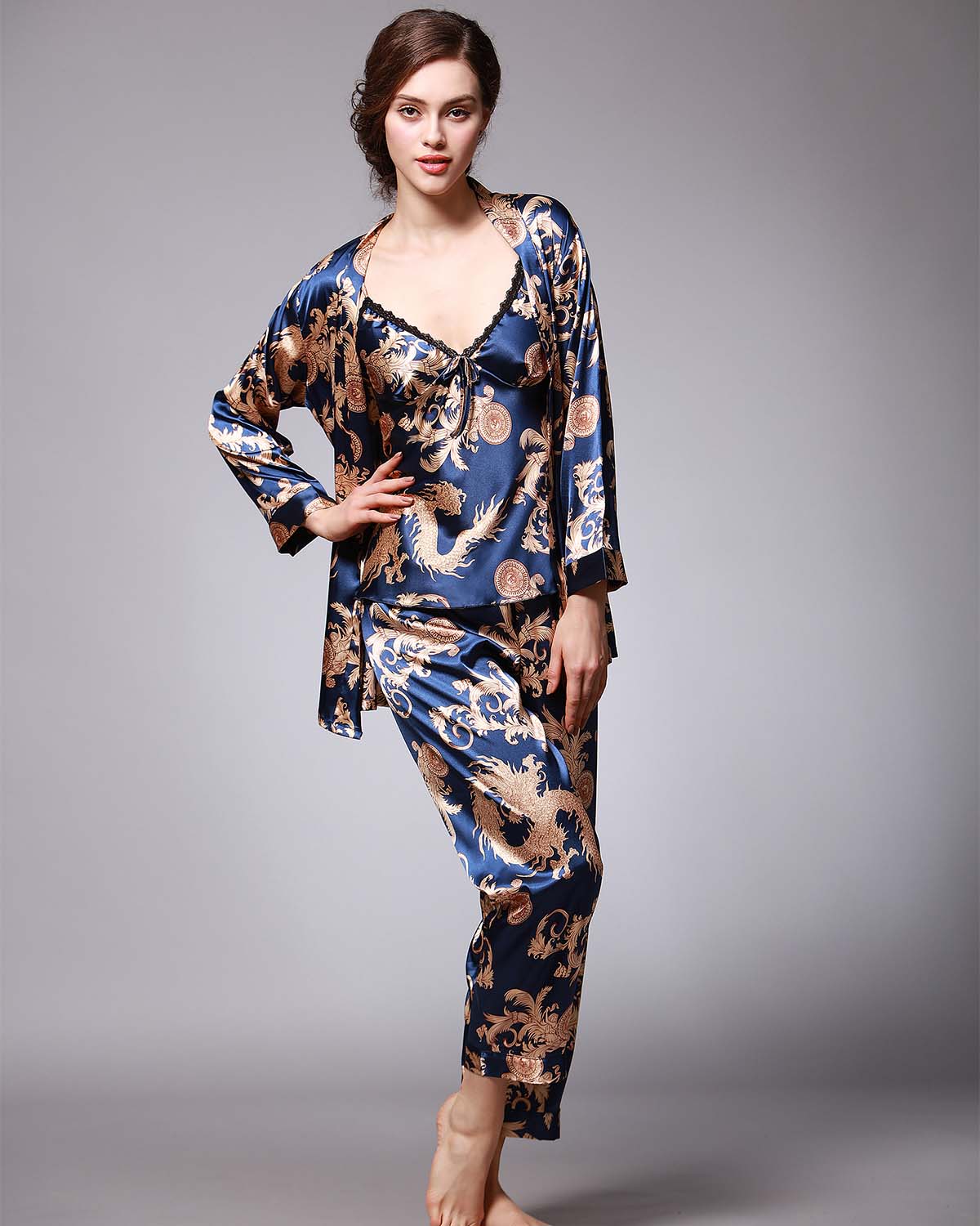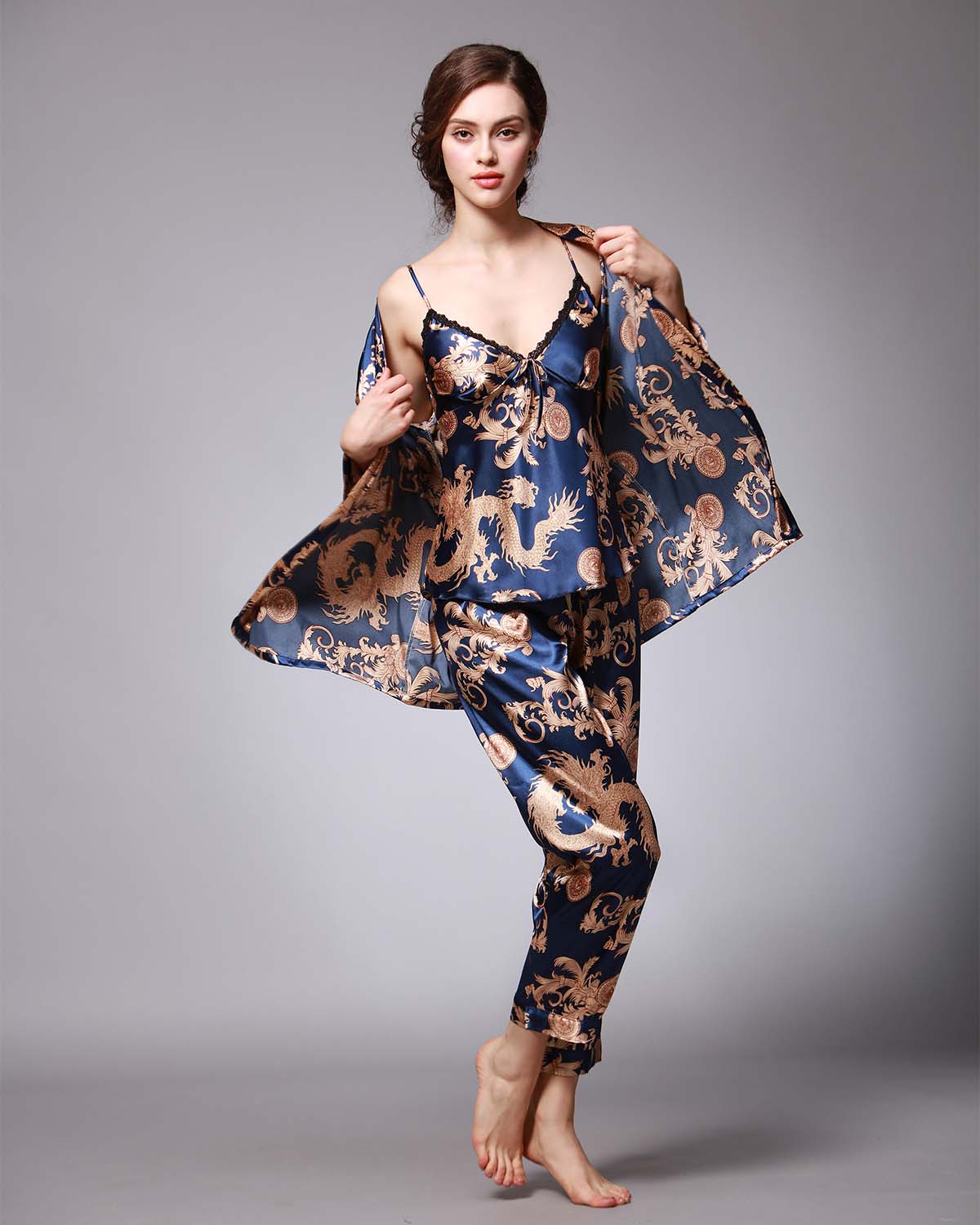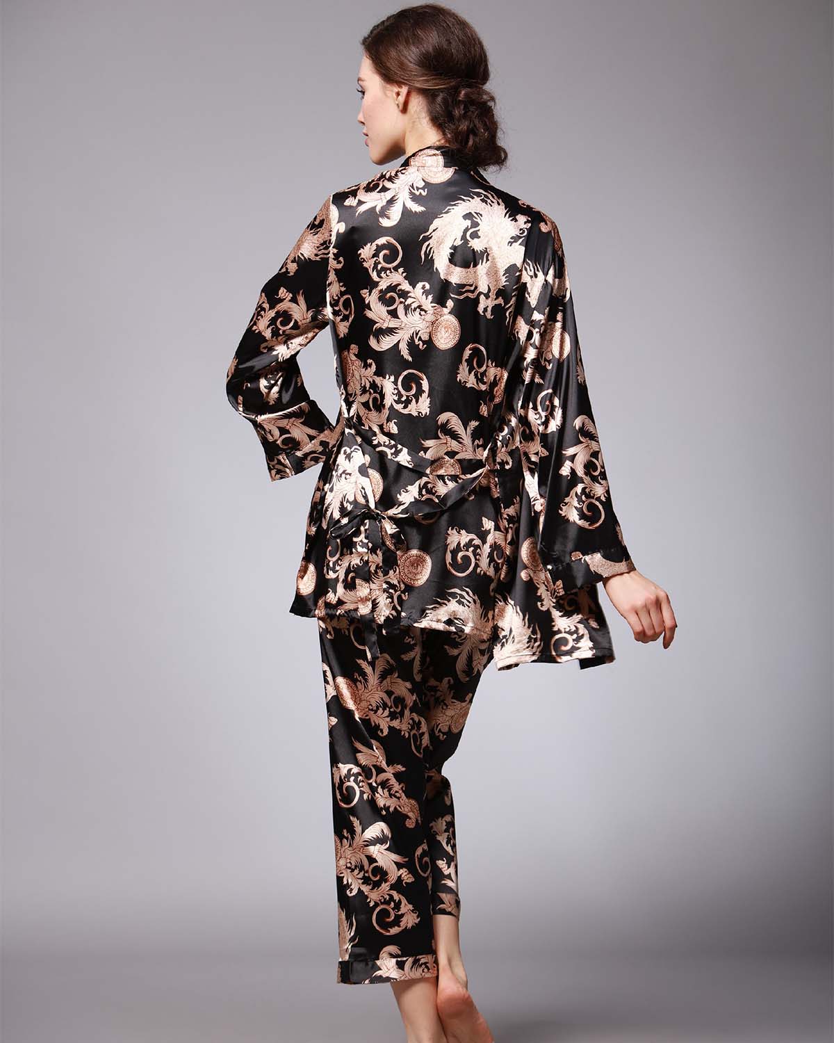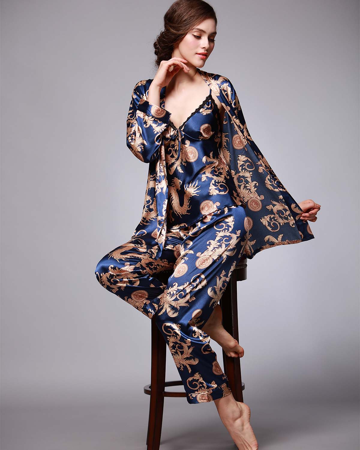 Elegant 3-piece loungewear set with Oriental dragon print, featuring deep V cami, matching pants, and short robe—perfect alone or paired with the coordinating men’s robe for a stylish couple’s look.