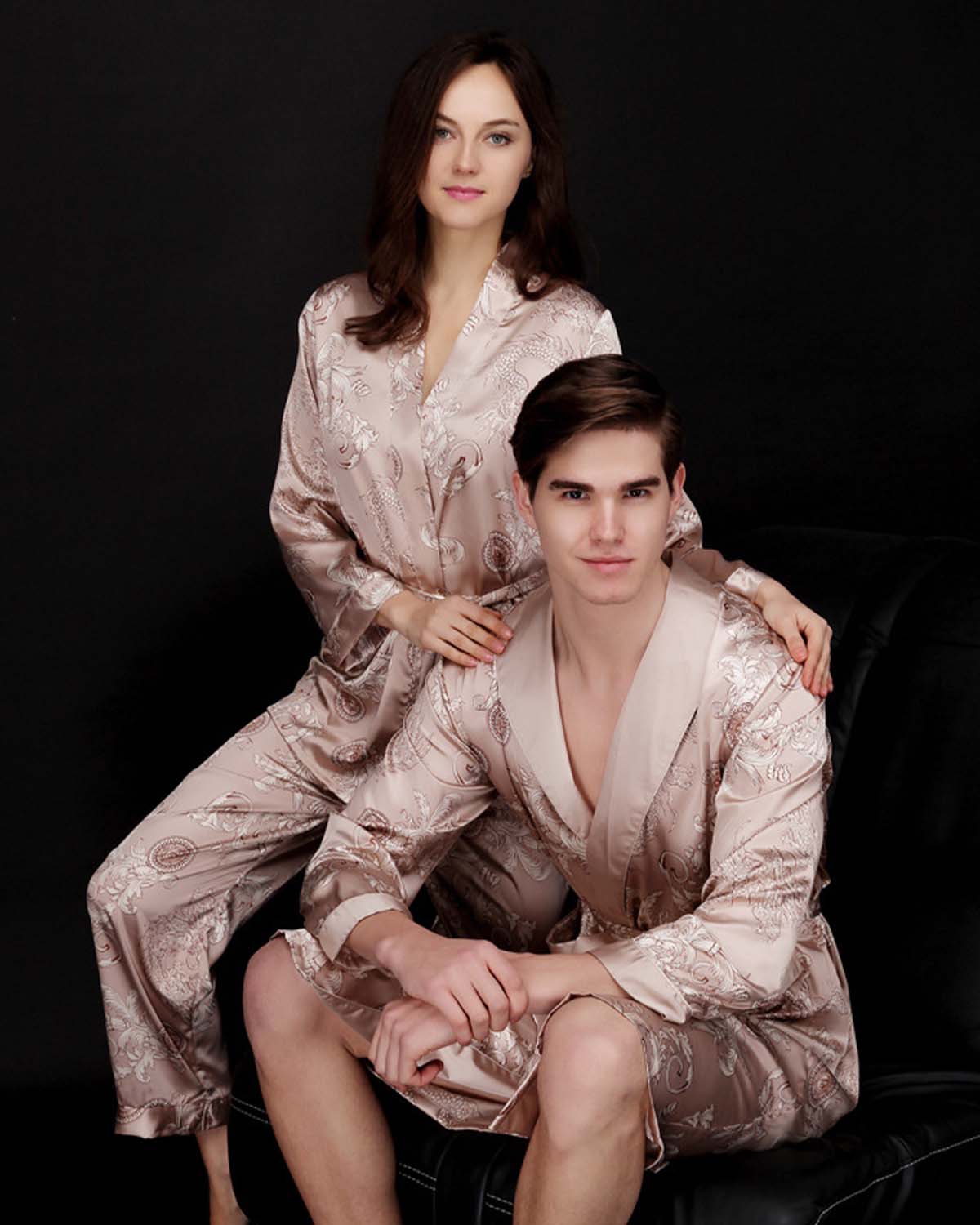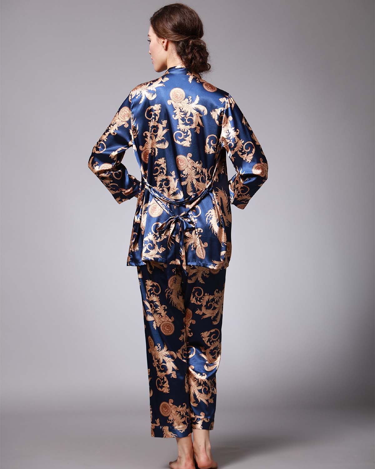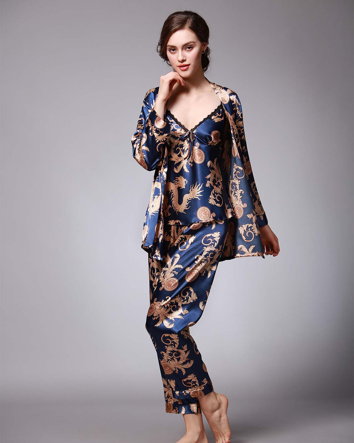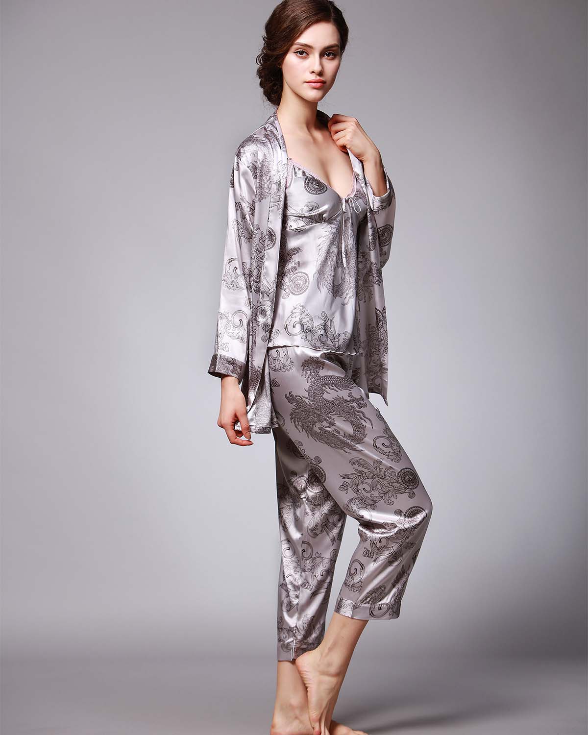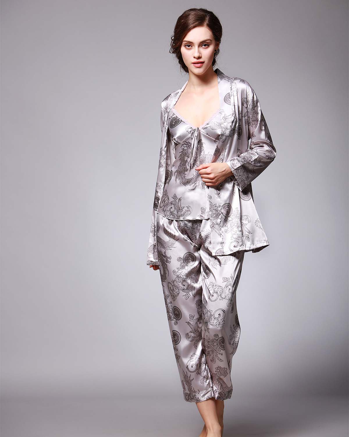 Elegant 3-piece loungewear set with Oriental dragon print, featuring deep V cami, matching pants, and short robe—perfect alone or paired with the coordinating men’s robe for a stylish couple’s look.