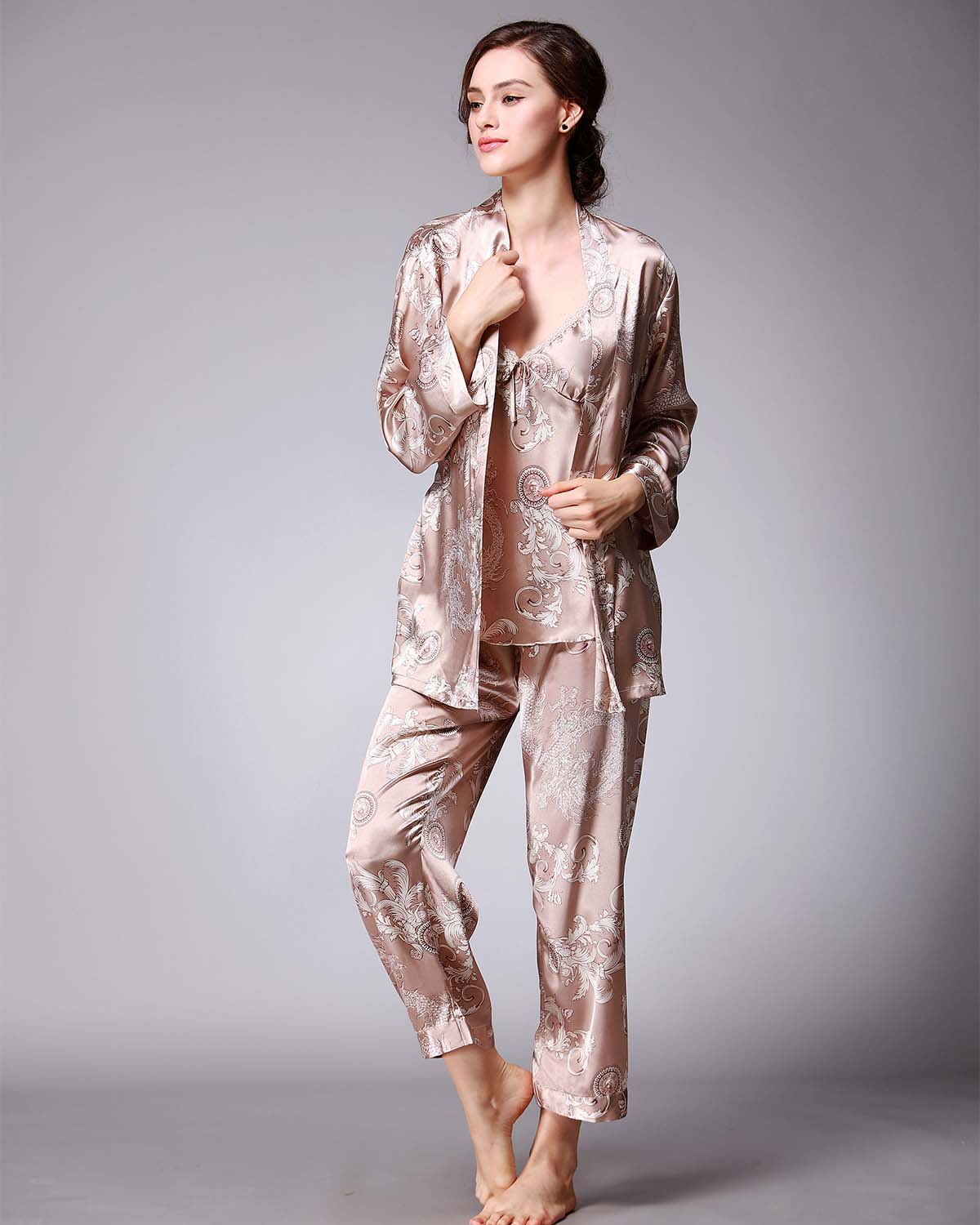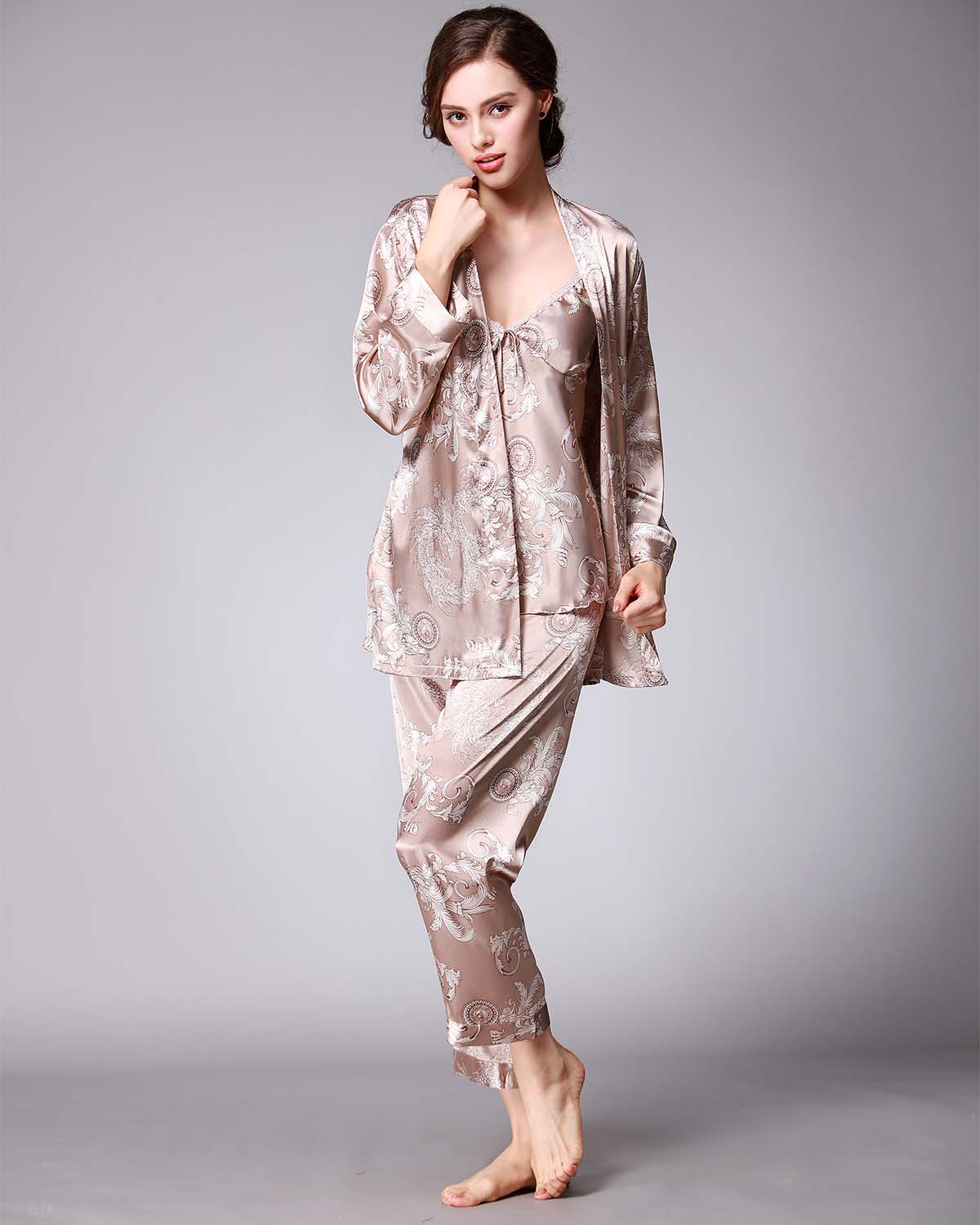 3-Piece Matching Set – Includes deep V cami with delicate trim, full-length pants, and a short robe
