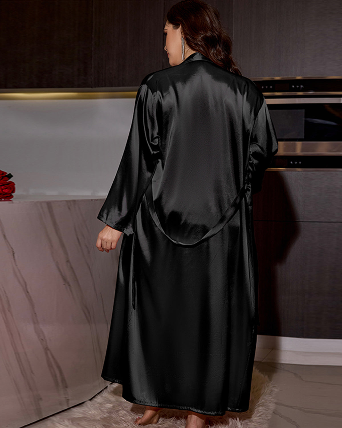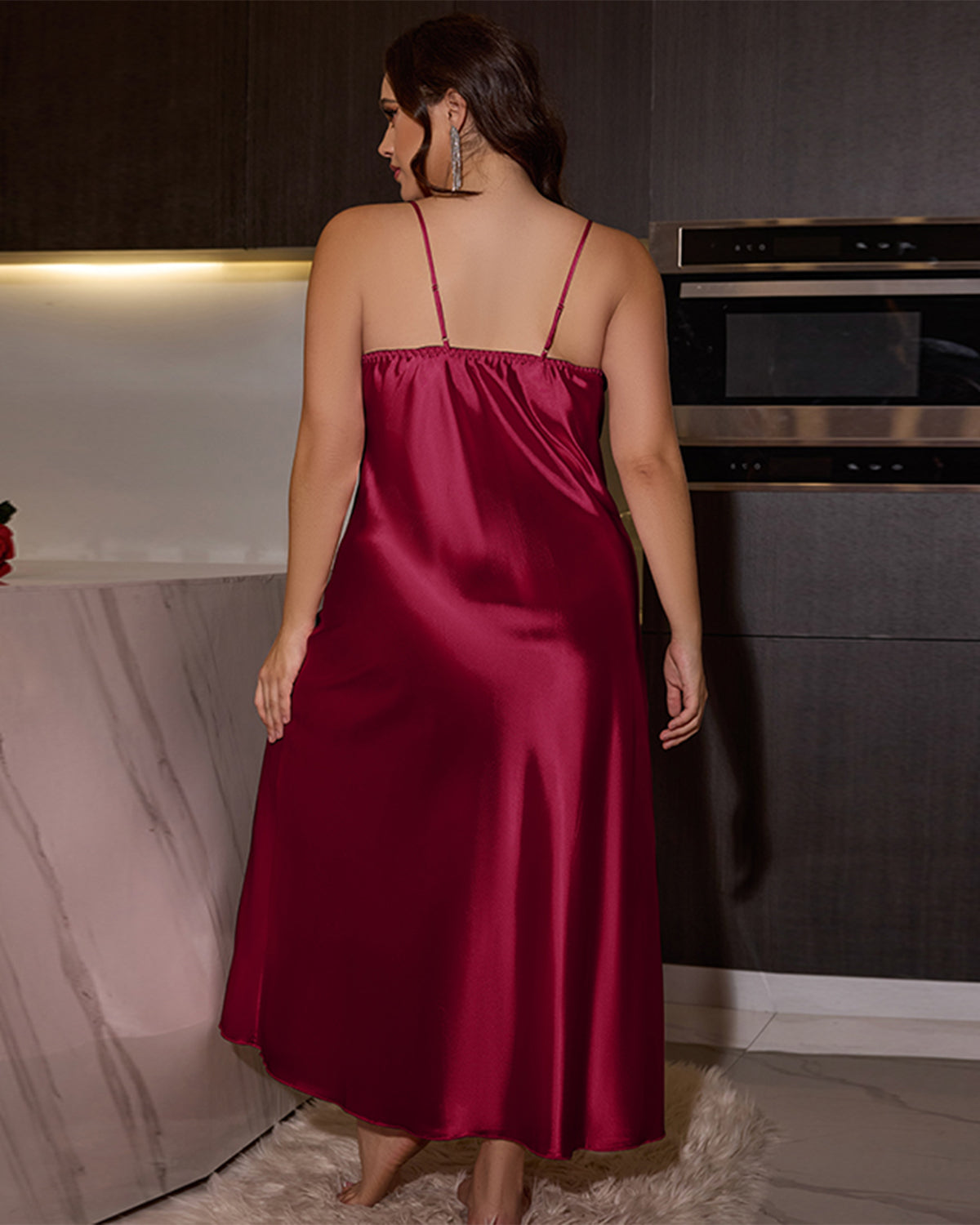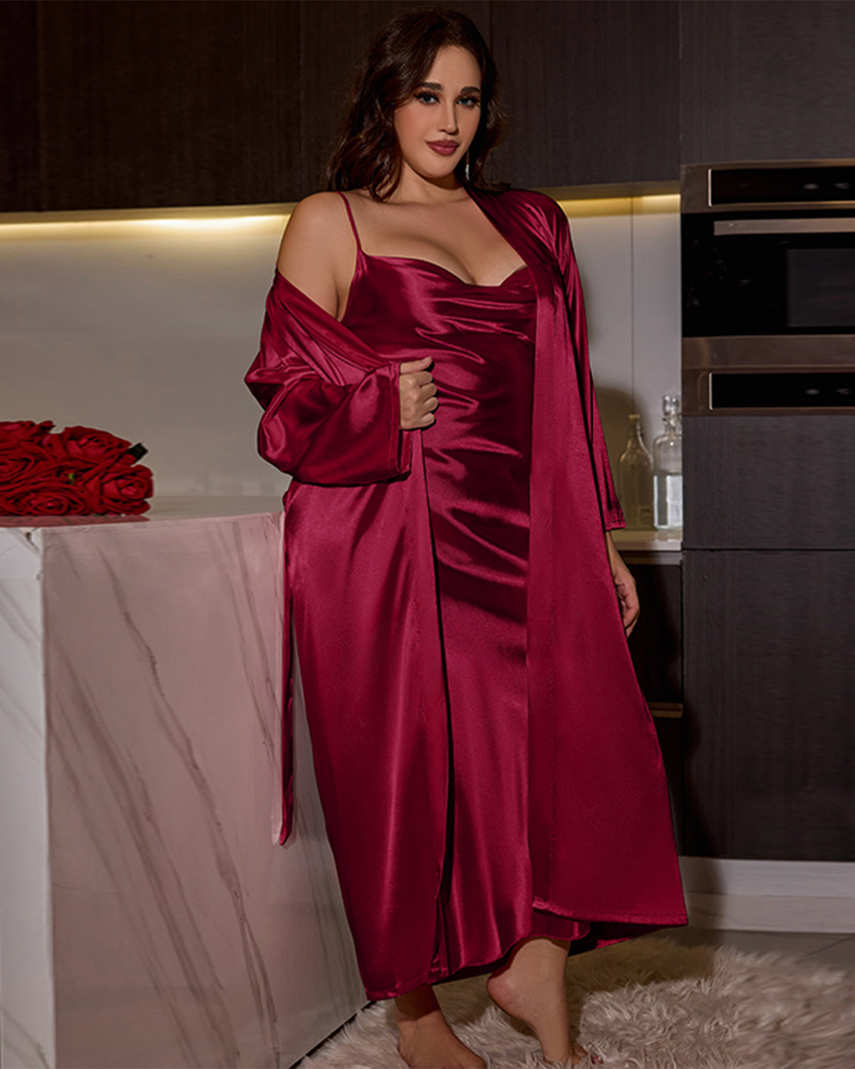 Elegant plus size two-piece set featuring a flowing cowl-neck nightdress and matching long robe. Made of soft ice silk, lightweight, breathable, and perfect for comfortable lounging.