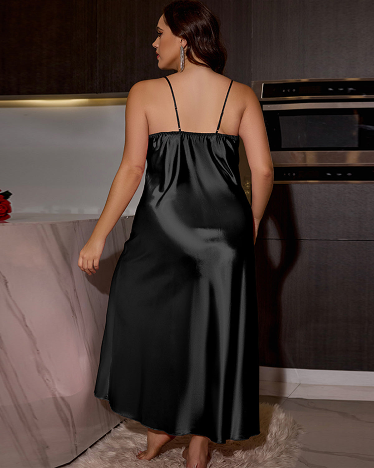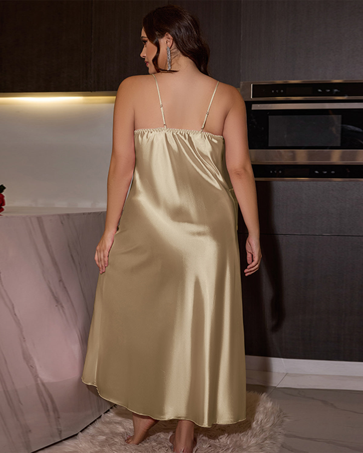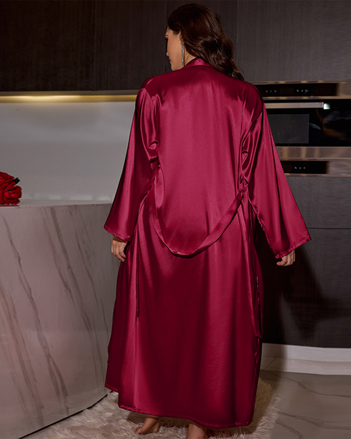 Elegant plus size two-piece set featuring a flowing cowl-neck nightdress and matching long robe. Made of soft ice silk, lightweight, breathable, and perfect for comfortable lounging.
