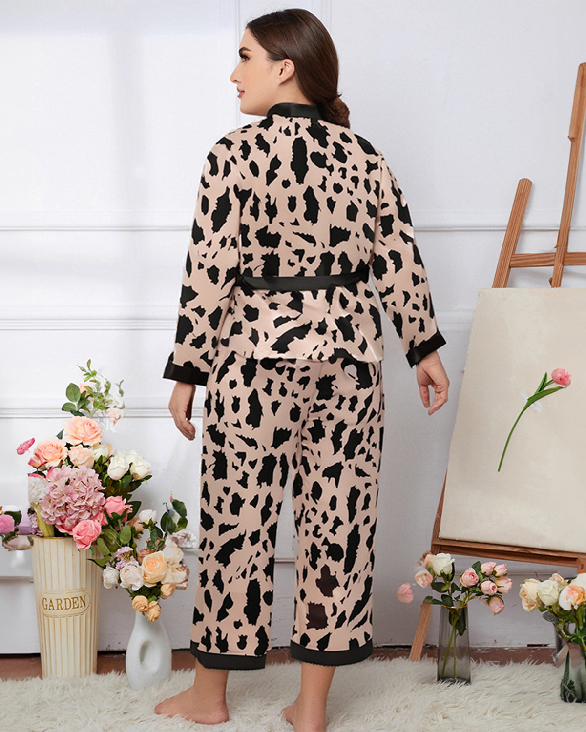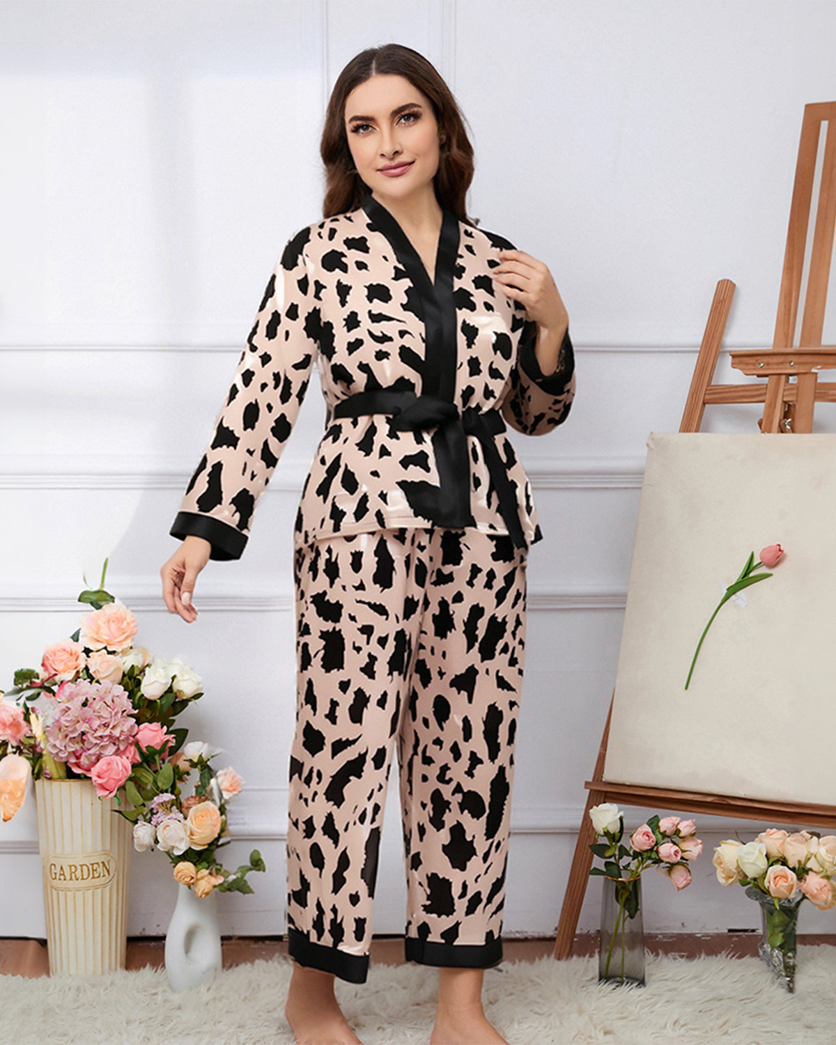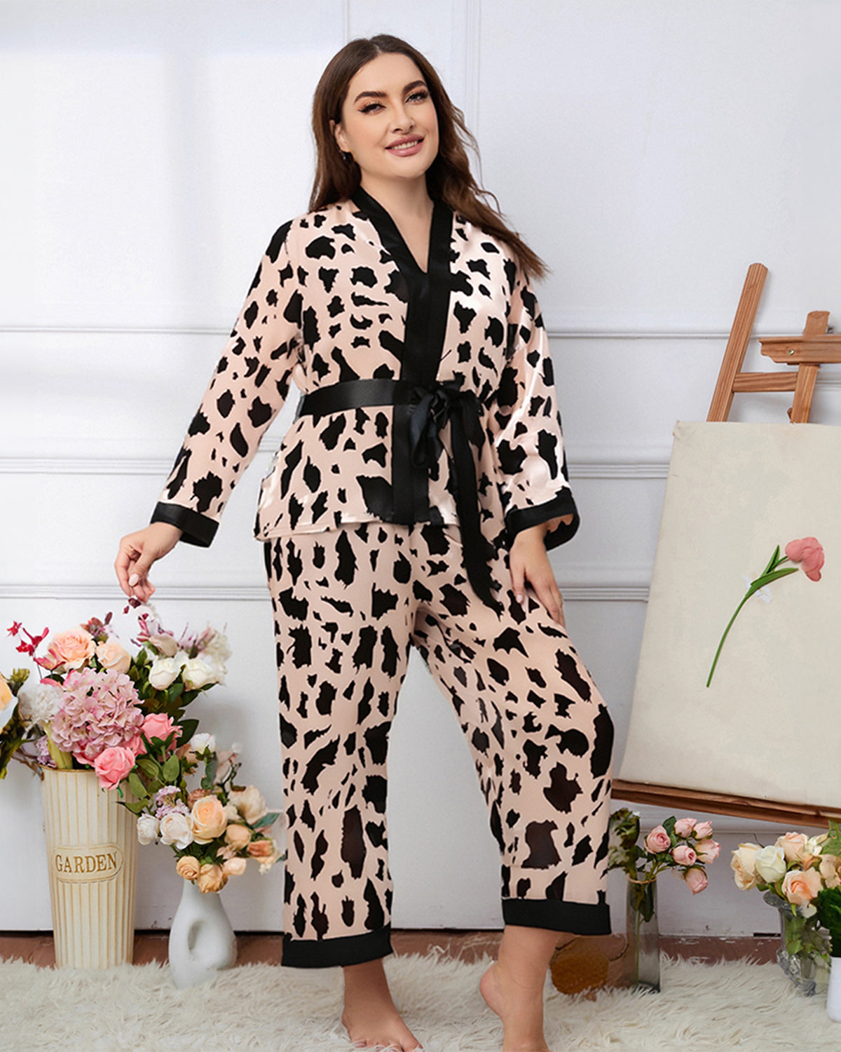 Stylish plus size leopard print pajama set featuring a wrap-style robe top with tie belt and matching long pants. Soft, breathable, and comfortable for lounging or sleep.