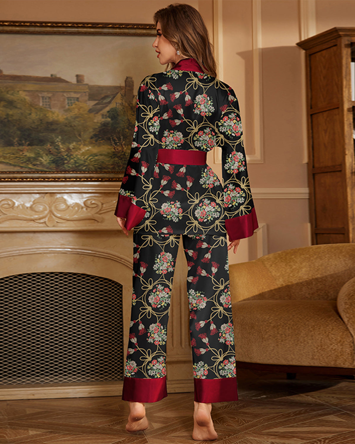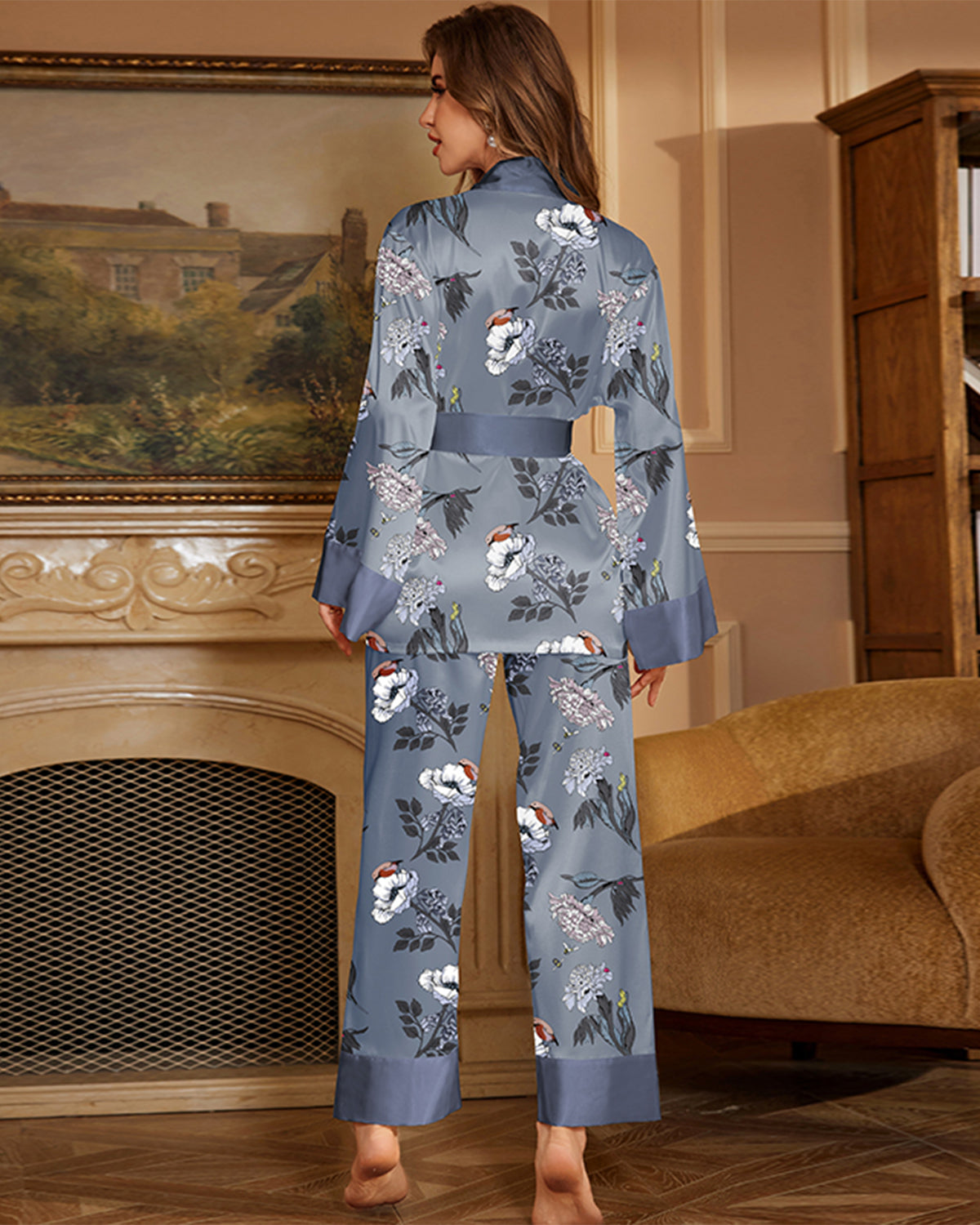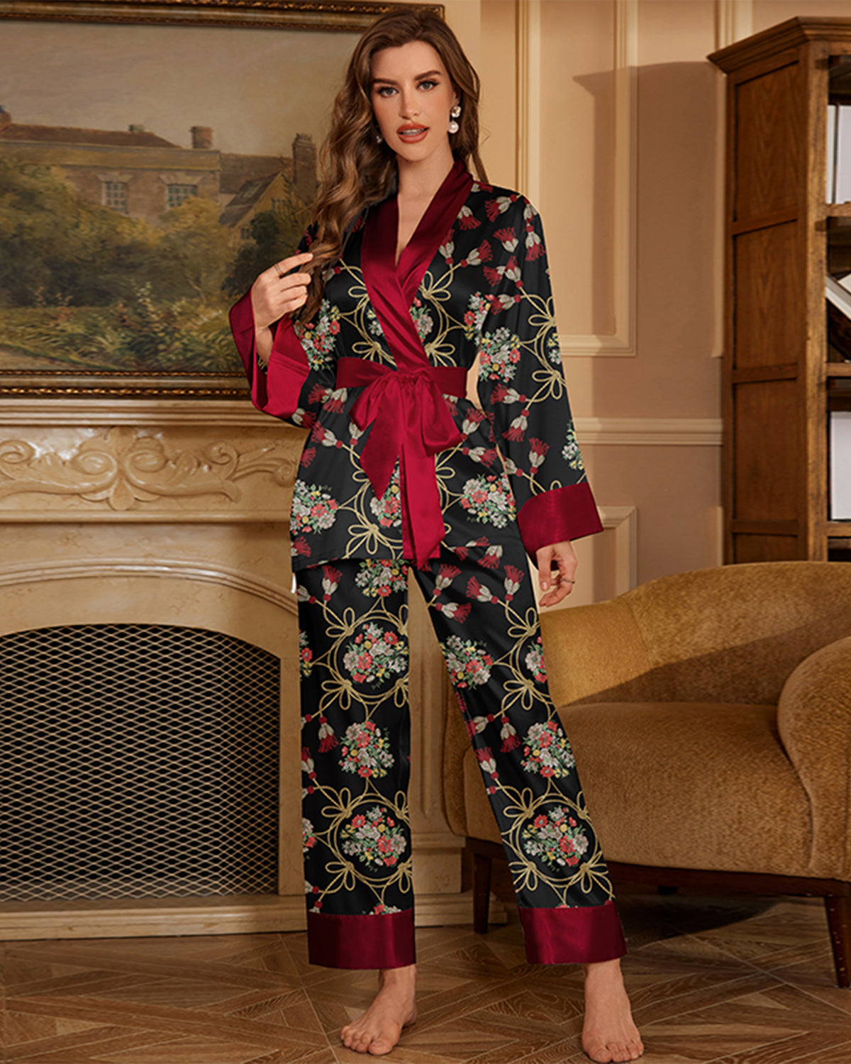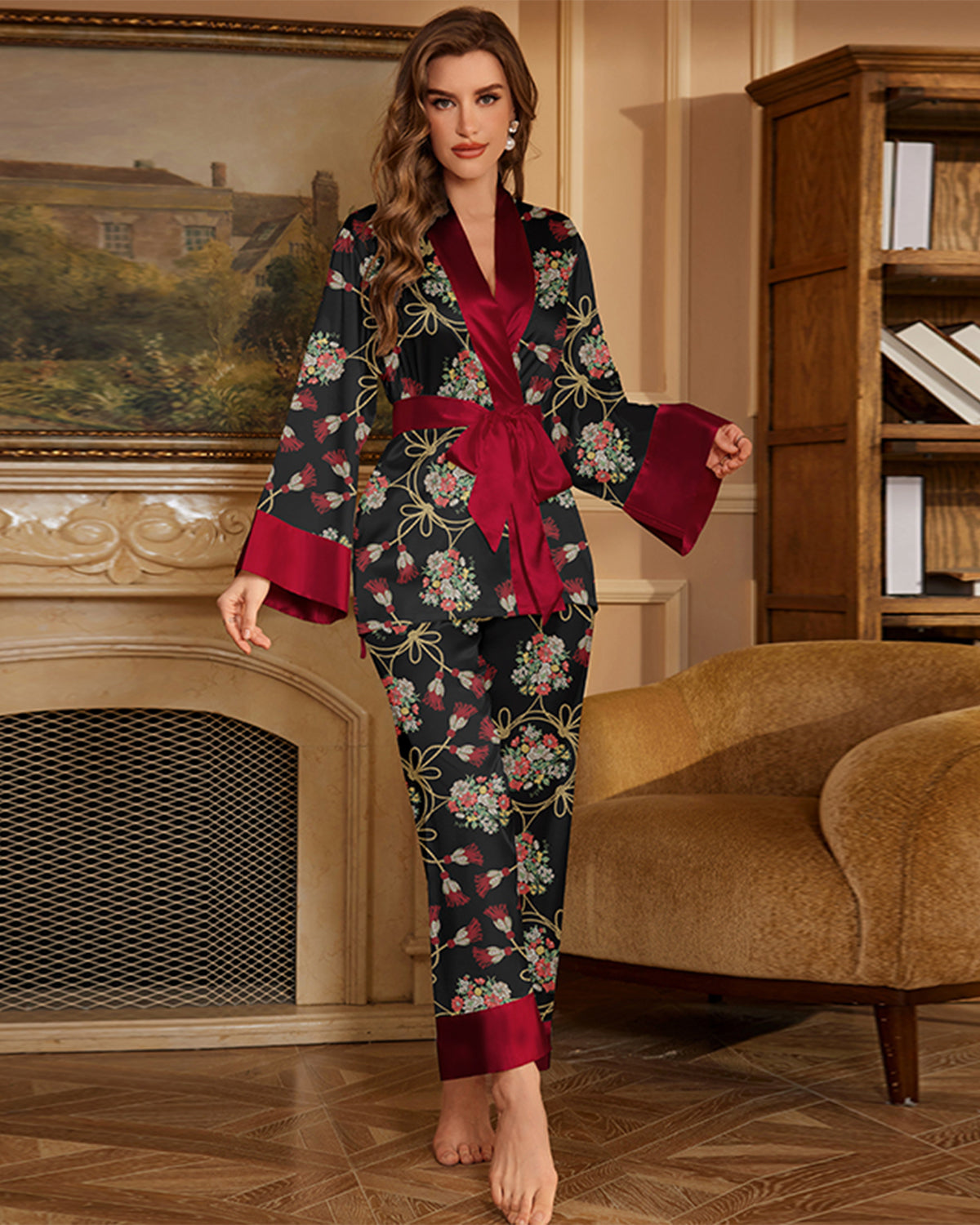 Elegant satin pajama set with floral print, robe-style belted top, and wide-leg pants. Lightweight, smooth, and breathable, designed for stylish comfort at home or lounging.