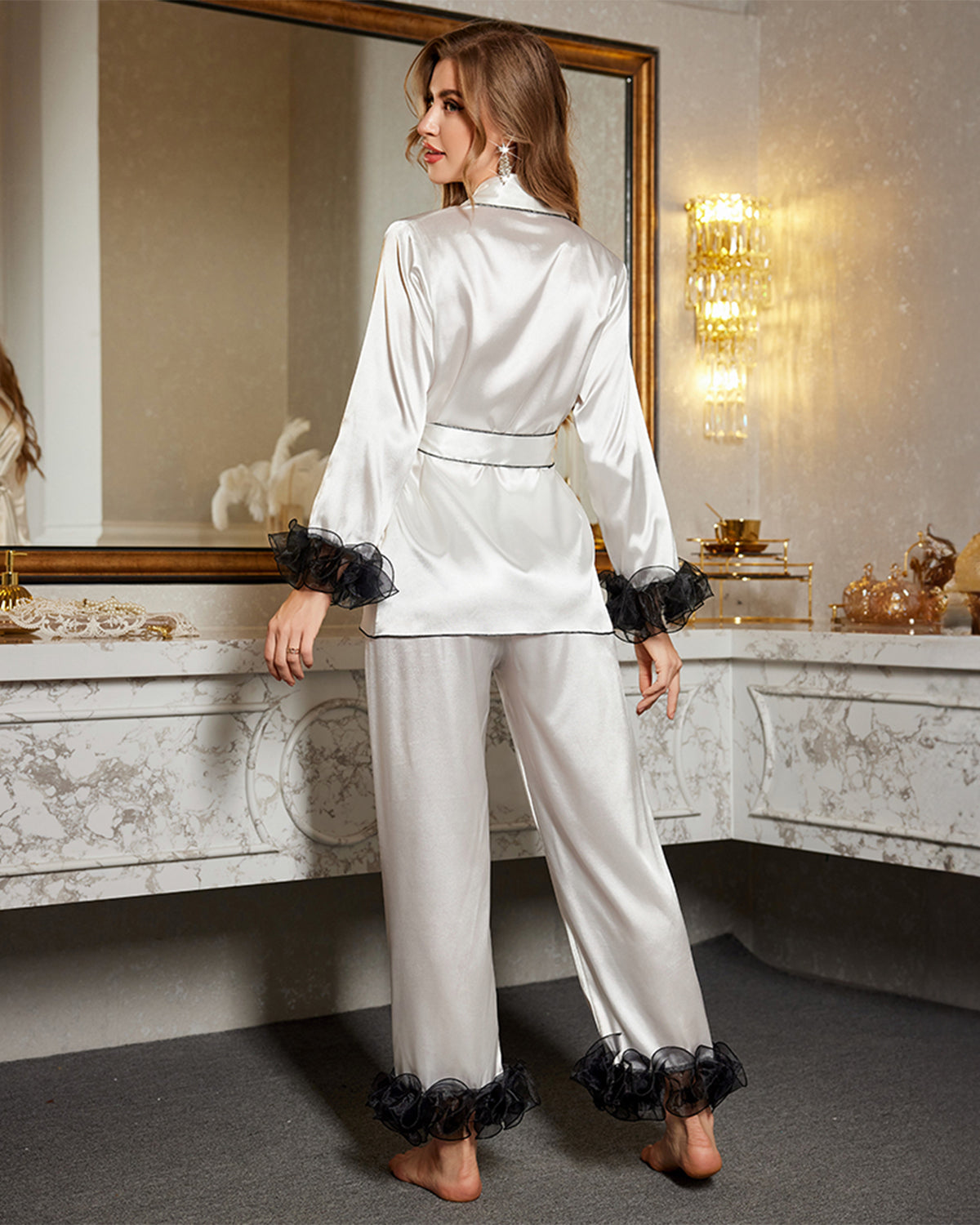 Stylish satin pajama set with ruffle organza trim on sleeves and pant cuffs, contrast piping on edges, bathrobe-style top with collar, and a tie-waist design. Soft, breathable, and figure-flattering for comfortable lounging.