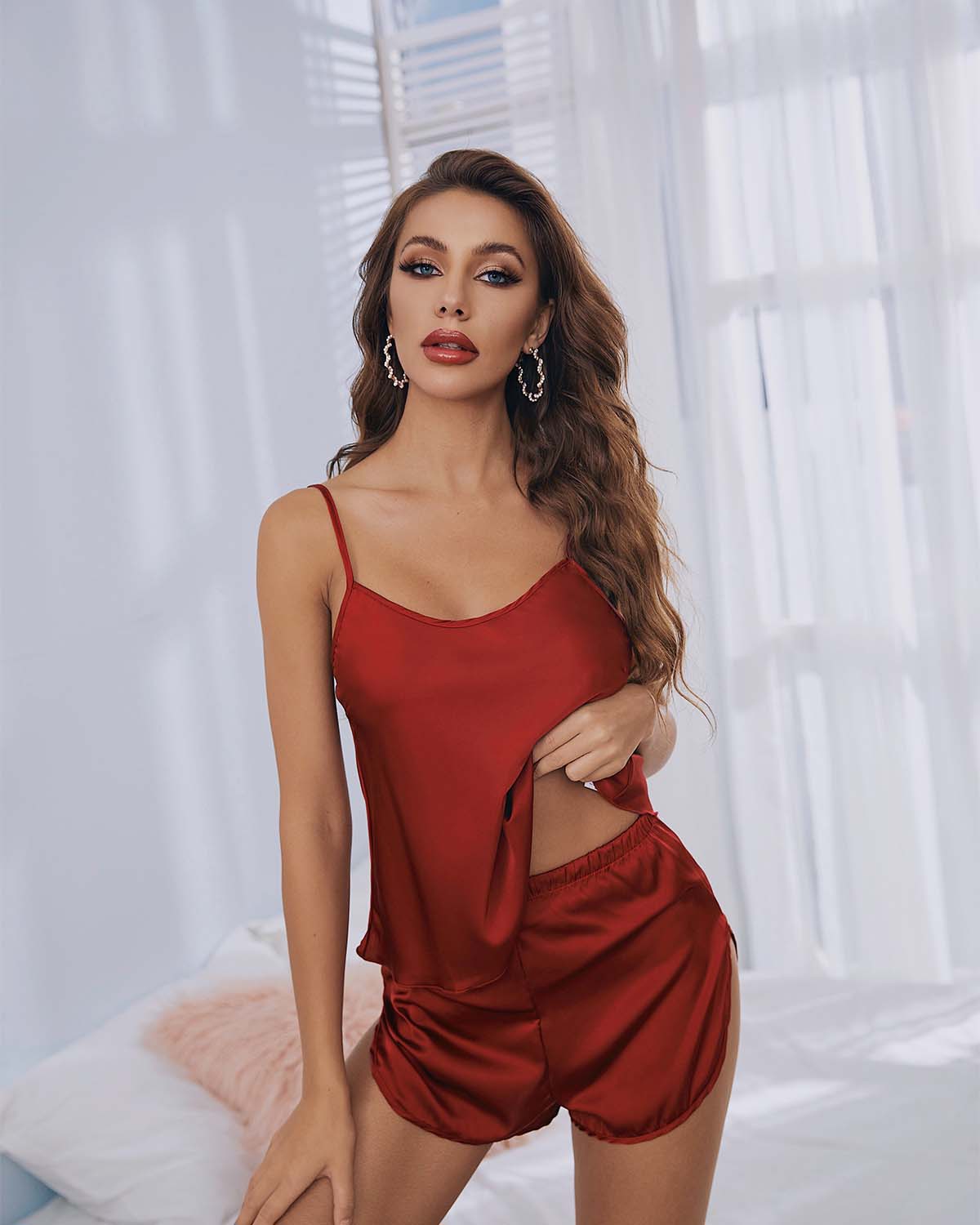 Matching Set – Includes a cami top and satin slit shorts for coordinated style
