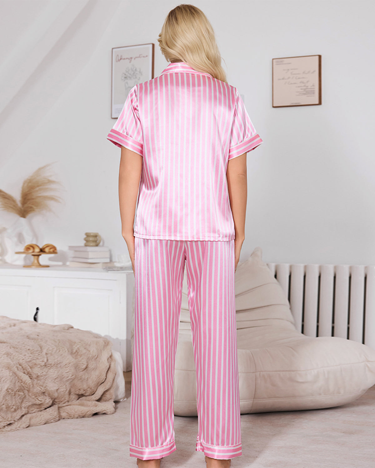 Chic striped pajama set with short-sleeve button-down top and long pants. Features a notched collar, contrast piping, and a relaxed fit for everyday comfort at home.