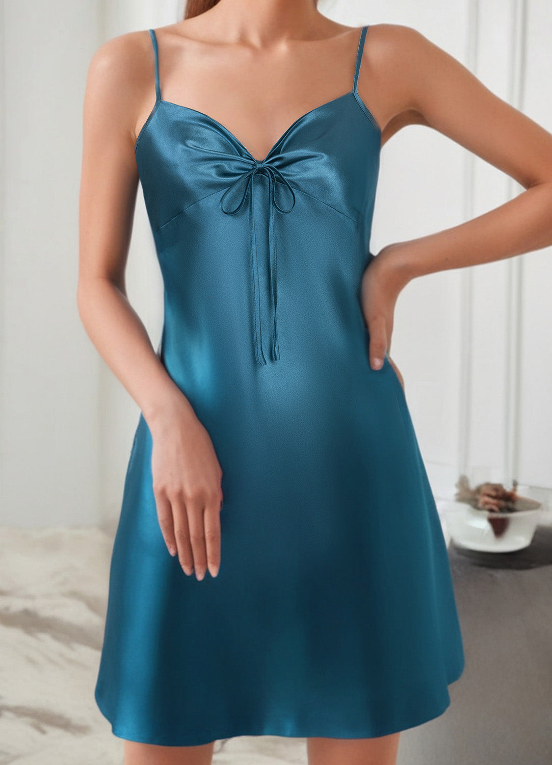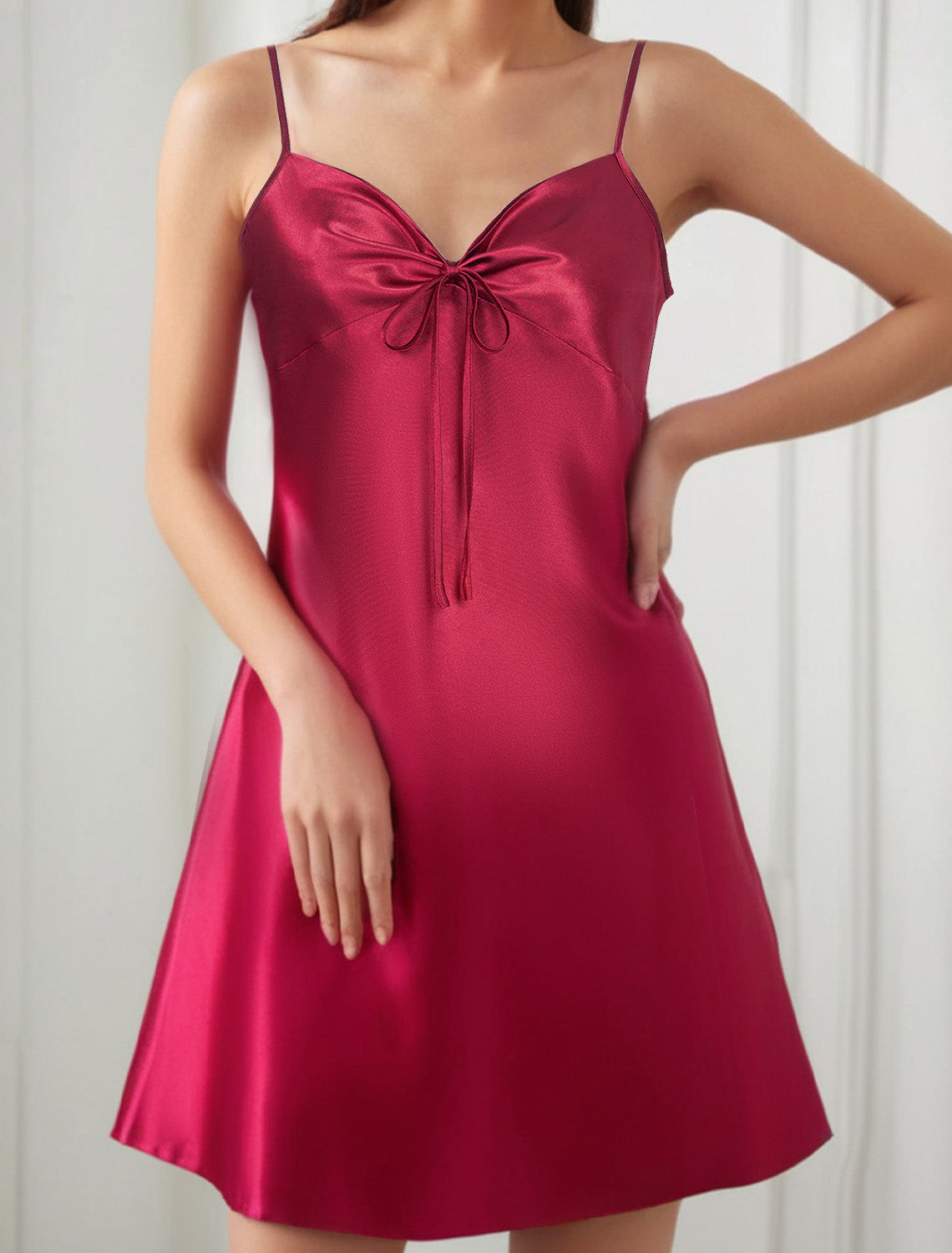 Lightweight cami nightdress with tie-front bow, ruched bust detail, waistline shaping, and adjustable straps. Breezy and feminine for summer lounging or sleep.