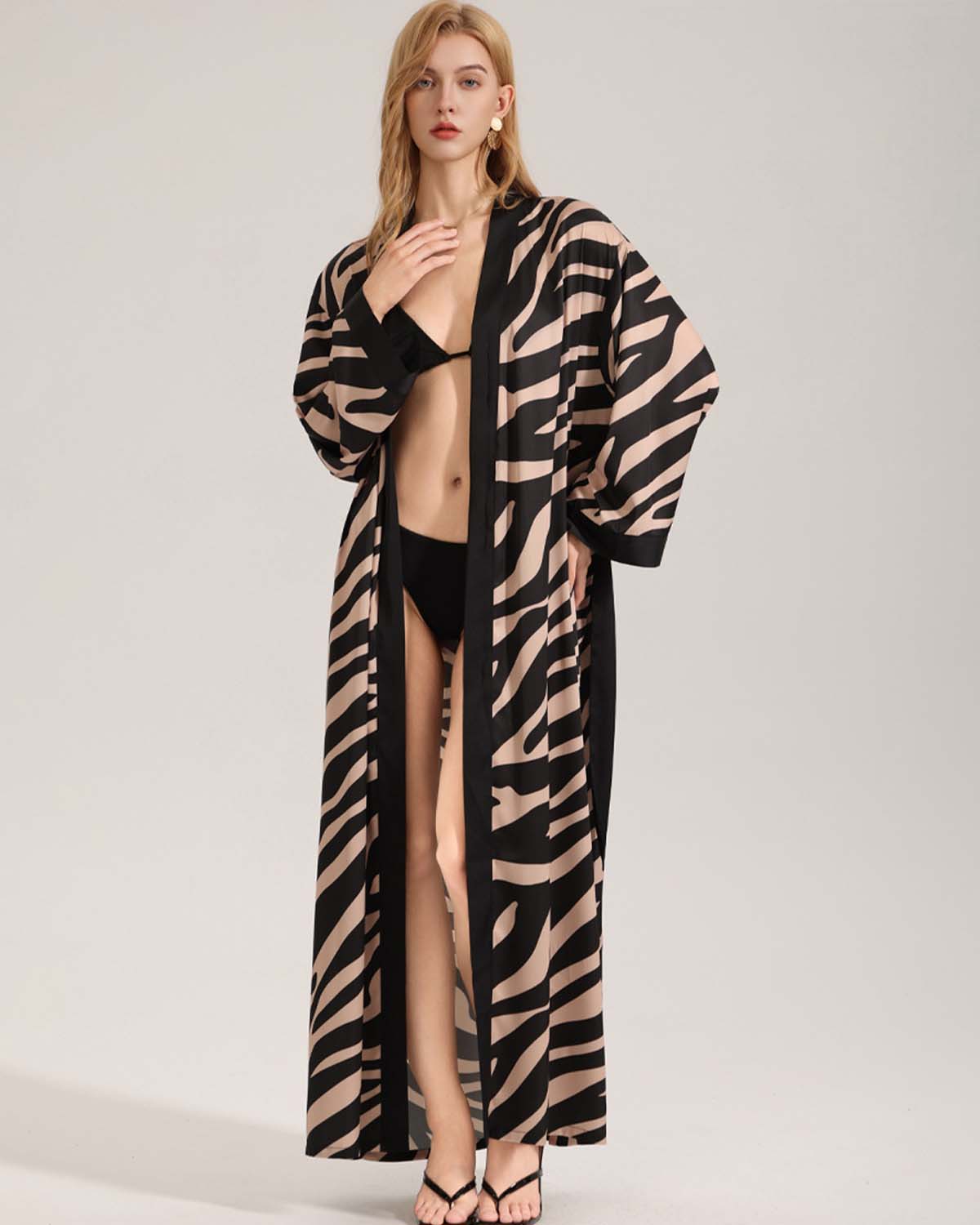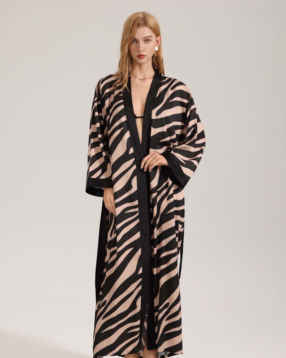 Elegant ankle-length robe with bold zebra print, delicate lace-trimmed long sleeves, and a tie waist. Lightweight chiffon drapes beautifully for a stylish yet comfortable homewear experience.